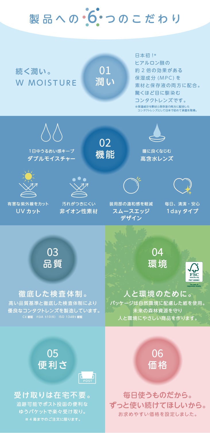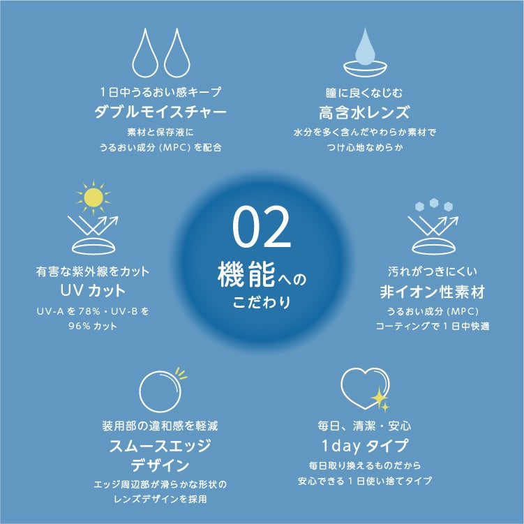 多くのコンタクト装用者の悩みとなっている「眼の渇き」に挑戦した、潤いにこだわった目に優しい高品質コンタクトレンズです。