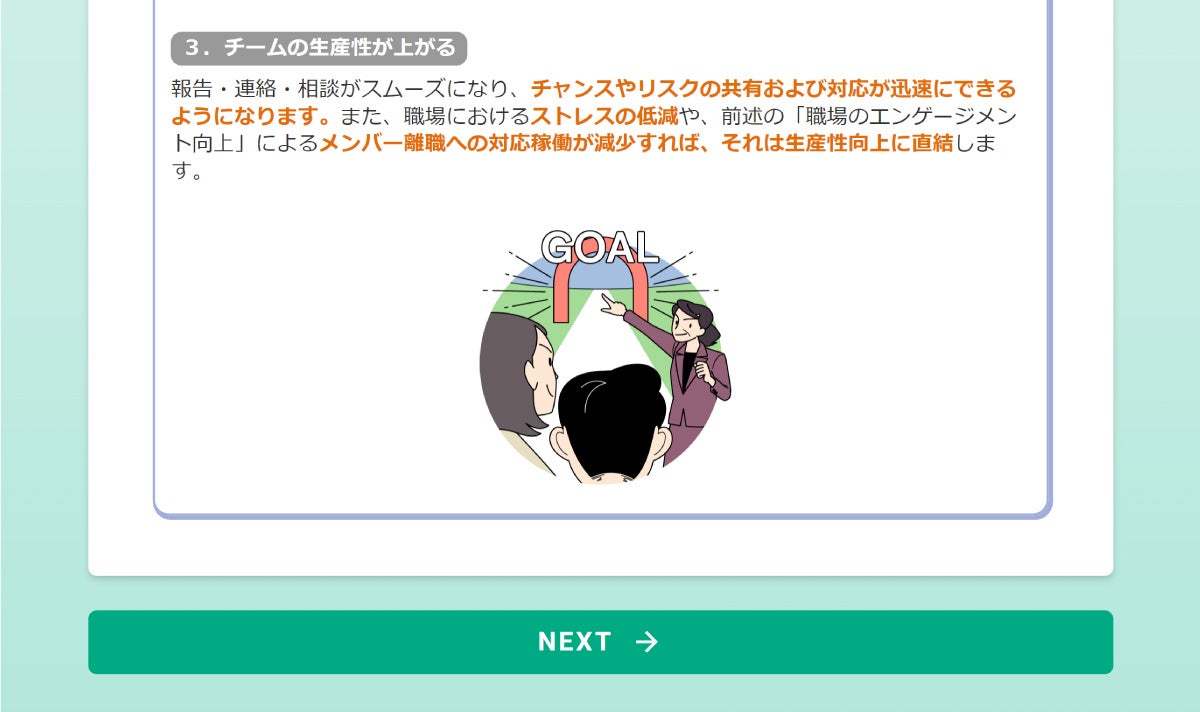3.アンケートの活用:学習後アンケートには、自分の組織の「心理的安全性」の確保状況を確認できるよう、意識調査の項目が入っています。本研修の実施を通して、職場ごとの「心理的安全性」の現状把握や改善策の検討にも活用いただけます。