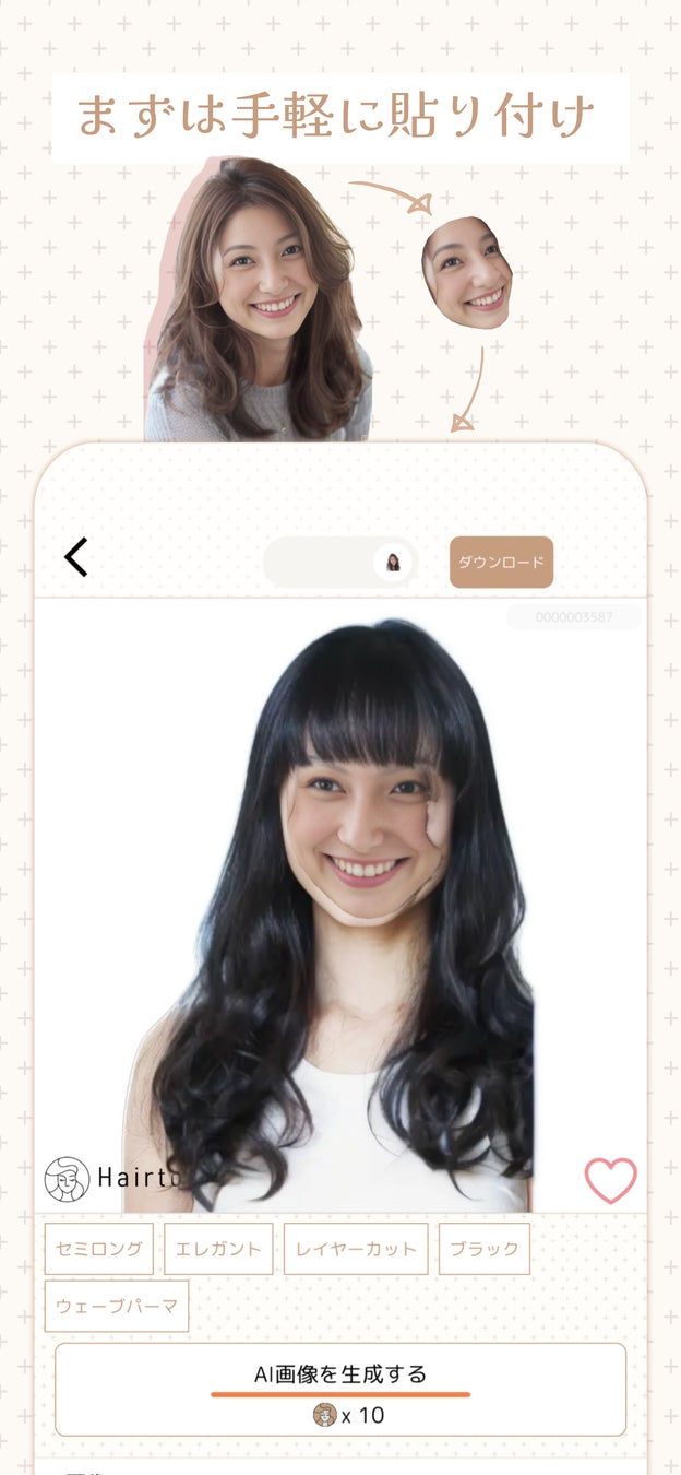 1万種類以上の髪型から選べる。AIが写真から顔の形を分析し、選択した髪型に即座に適用。
