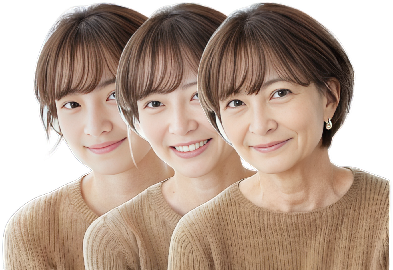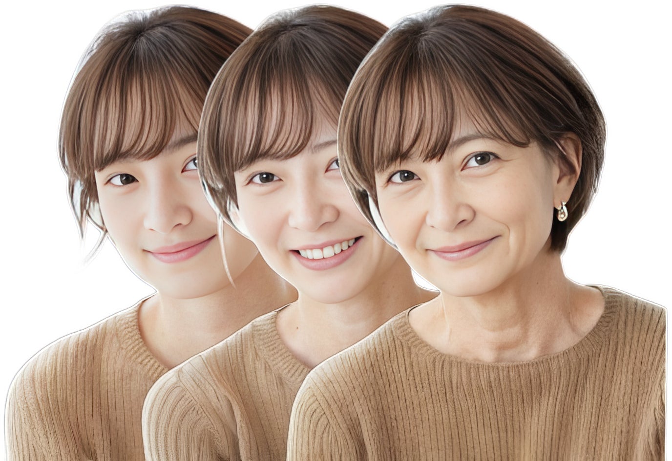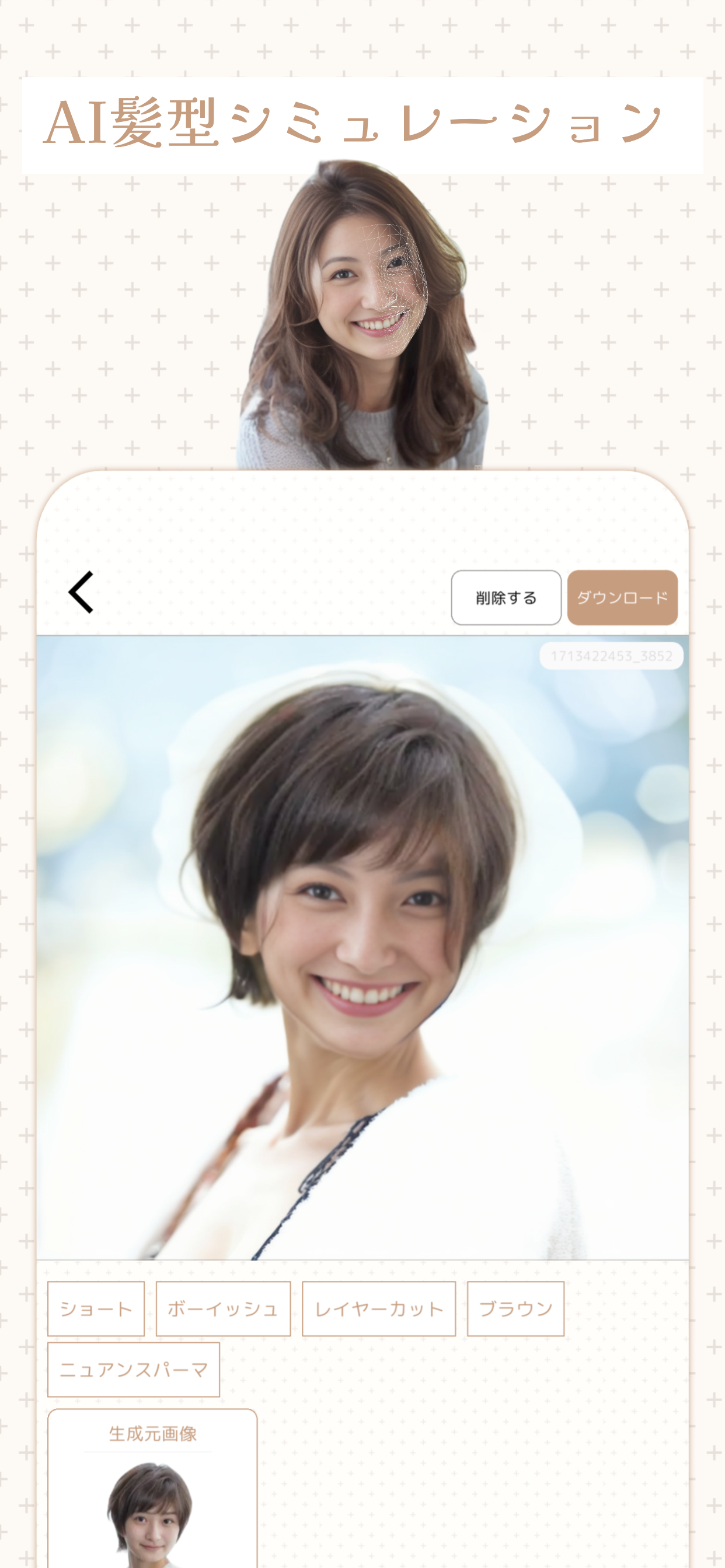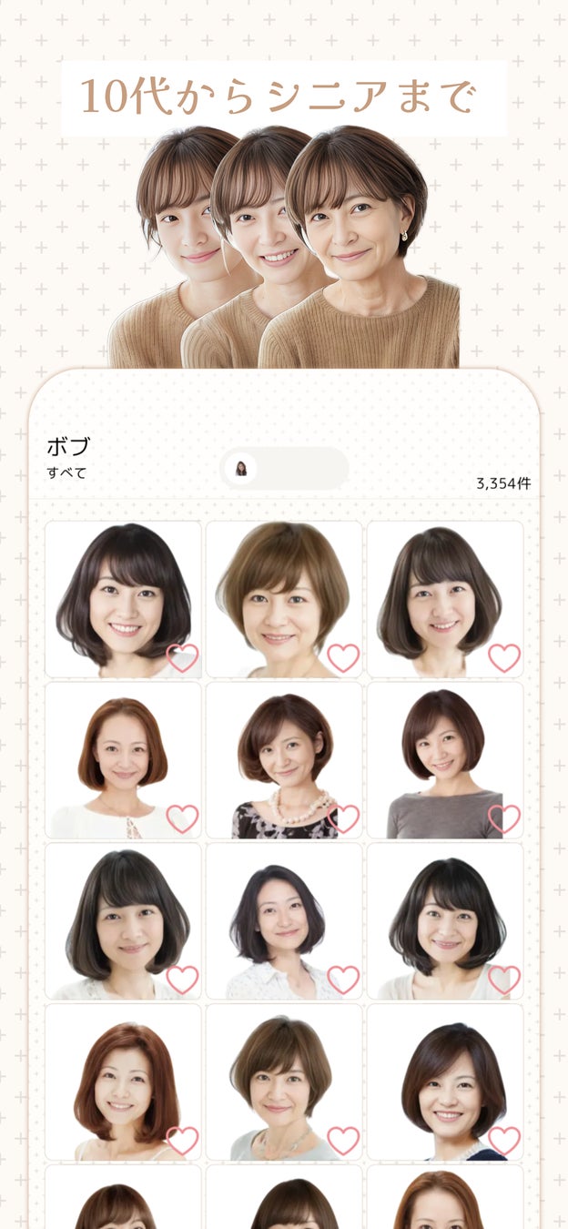 アプリ内には、「10ー20代」、「30-40代」、「50-60代」の3つの年代タイプの髪型カタログがあります。年代ごとの髪型モデルは生成Aにより生成されたモデルで、ユーザーは自分の年代に合ったモデルで髪型を確認することができます。