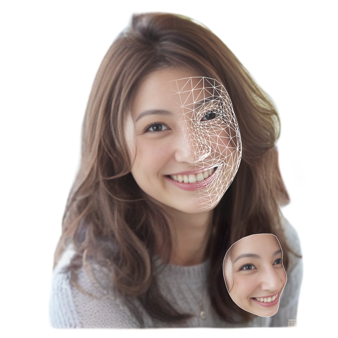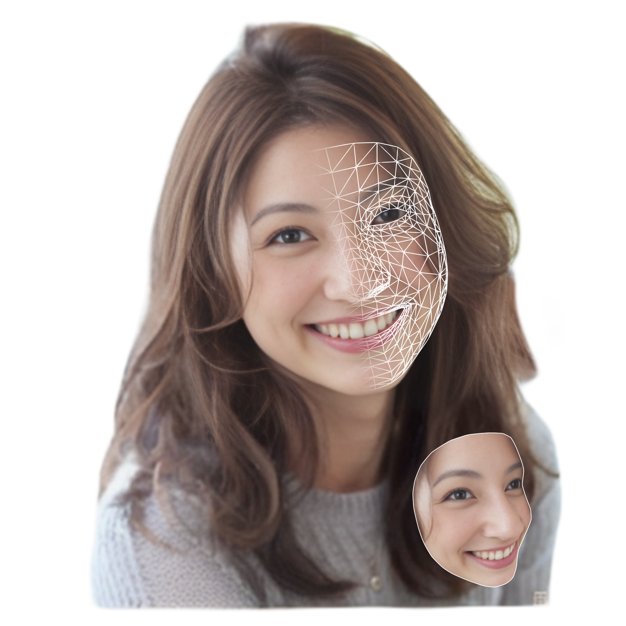 AI(ディープラーニング)を活用して、アップされた写真から顔の形を認識・抽出し、3D化します。この処理はサーバーではなく端末内で行われるため、即座に完了します。