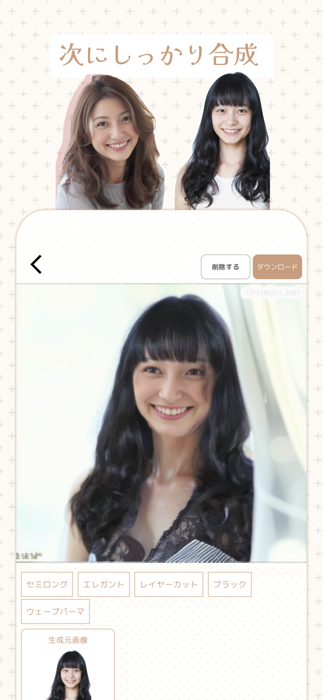 3D化された顔を髪型モデルの顔の位置に貼り付けます。顔の位置調整は端末内でAI(ディープラーニング)により即座に行われます。
