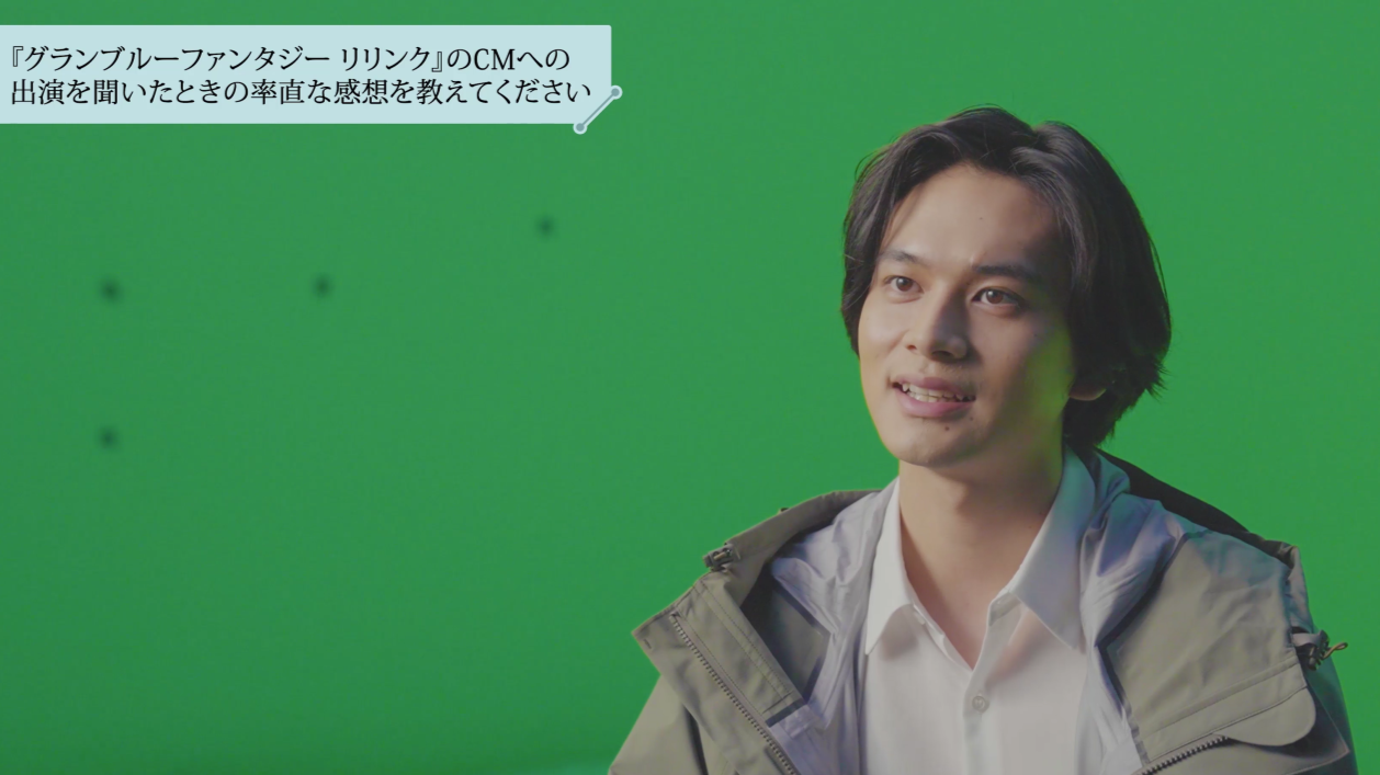 動画をご覧になっている皆様、北村匠海です。この度、『グランブルーファンタジー リリンク』のCMに出演いたしました。このCMでは、僕をはじめ現実世界で生活を送っている人たちが『グランブルーファンタジー リリンク』で壮大な冒険に出かけられるということを表現しています。2月1日の発売日近辺で全国で放映されるそうなので、楽しみにしていてください。ぜひ一緒に冒険に出かけましょう。よろしくお願いいたします。