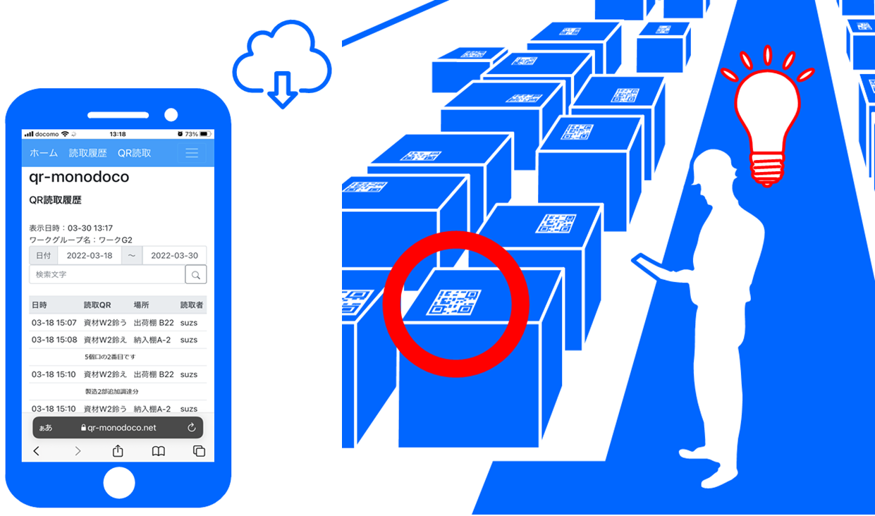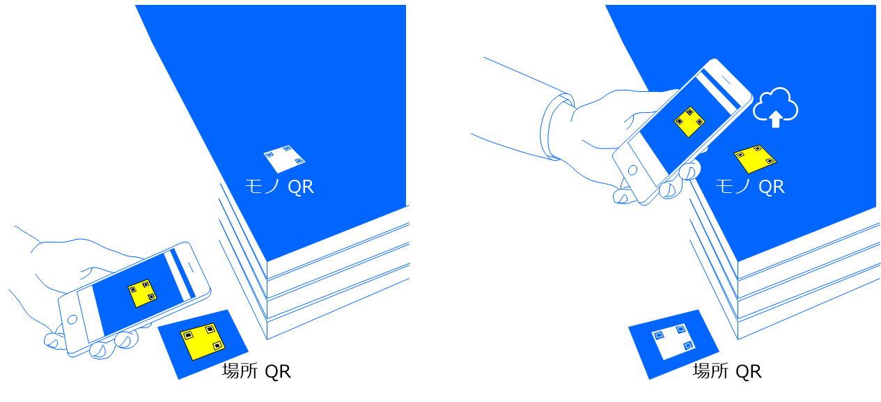 1) 搬入時: 商品や資材を搬入した担当者が「場所QR」(特定の棚・番地に貼り付けされたQRコード)と「モノQR」(商品や資材に添付されたQR)を交互に読み取ります。これにより「どこに何が、いつ誰によって」搬入されたかの情報がクラウドに上げられます。