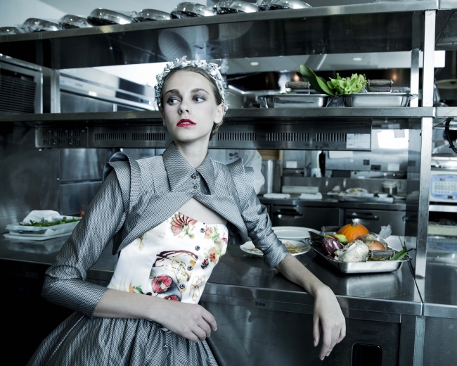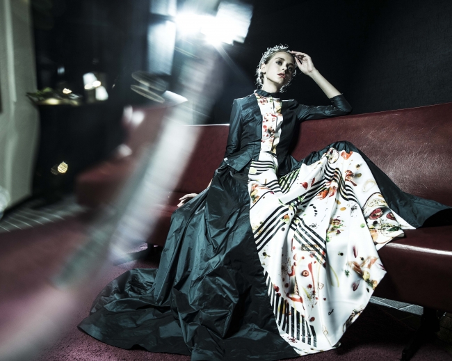 ランウェイでは、料理とコラボした新作コレクション『dress+ing(ドレッシング) 2017』のショーを展開。“料理を着る”という独創的なアイデアを体現したドレスたちが、会場を美味しく華やかに彩ります。使用しているテキスタイルの料理は、今回の10周年記念パーティーの会場であり、世界的な建築家アルド・ロッシが手がけたデザイナーズホテル「ホテル イル・パラッツォ」(http://www.ilpalazzo.jp)の総料理長である村上シェフが担当。Quantizeの軸であるオートクチュールを生かした上質なモードと相まって、絶妙な美しさを奏でます。