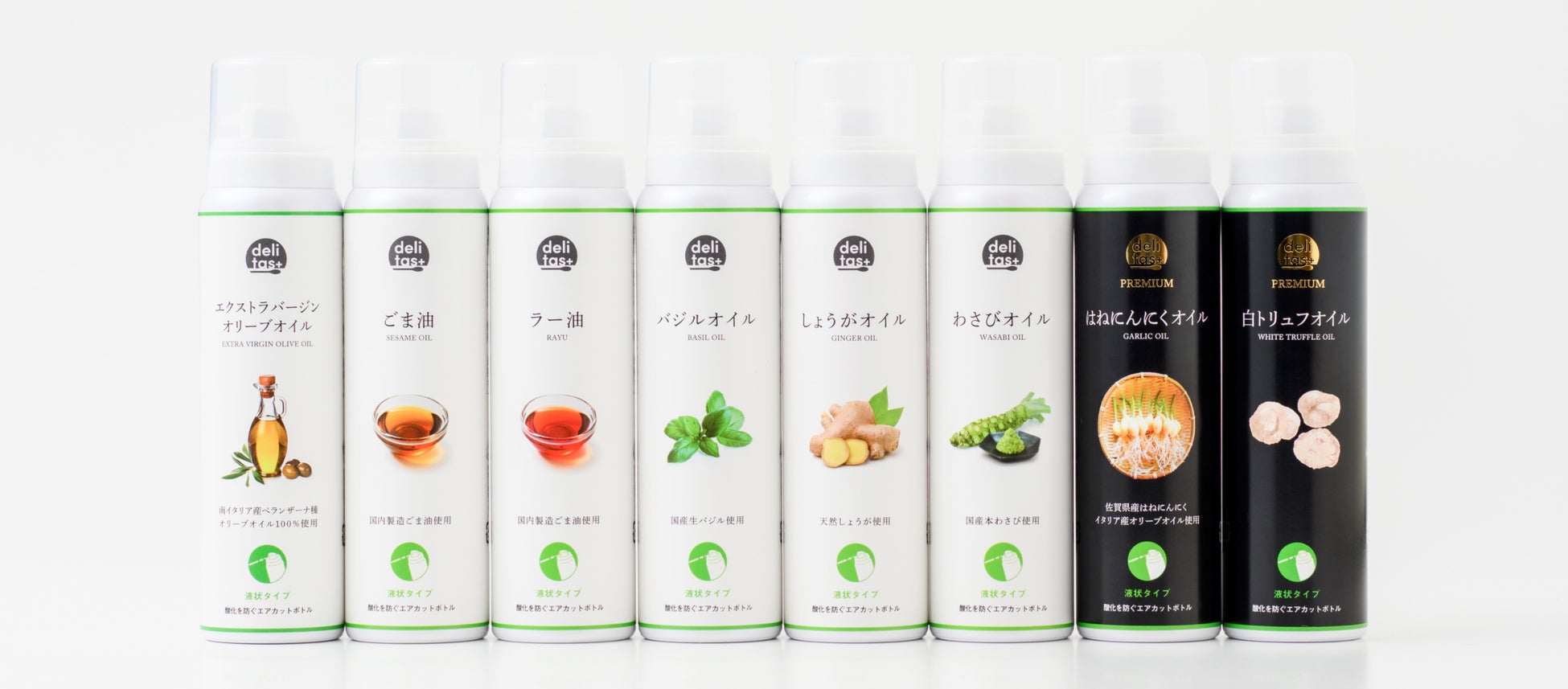 シリーズ第一弾は、オイルを液状で吐出する8種類のスプレー。風味豊かなフレーバーオイル5種類(バジル・しょうが・わさび・はねにんにく・白トリュフ)に加えて、日常的に使いやすいオリーブオイル、ごま油、ラー油をご用意しました。