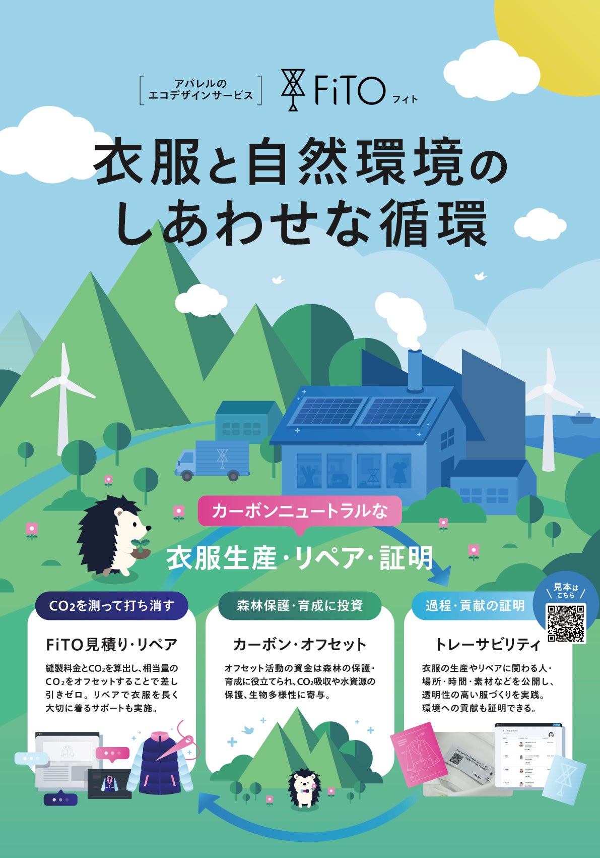 製品概要:FiTOはサステナブルな衣服生産とアウトドアウェア愛用者向けリペアを合わせたサービス。Webアプリで依頼でき、森林由来のクレジットを用いてCO₂排出実質ゼロの衣服生産や服のリペアでヘルシーなアパレルを実現します。製品情報はQRコードによりデジタルパスポートとして開示されます。収益の一部が地域の森林管理・保全を支え、生物多様性に寄与。大切な服を長く使い環境負荷を減らし循環型ファッションを推進します。