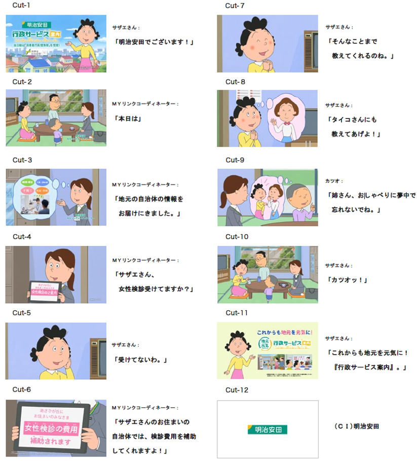 明治安田生命保険相互会社(執行役社長 永島 英器)は、連携協定を締結している自治体と協働し、「MYリンクコーディネーター等(営業職員)」が、地域のみなさまの「健康増進」「介護・認知症」「子育て」「防災・防犯」の4つの分野に関する生活課題を確認し、その解決の一助となる行政サービスの情報提供活動を行なう「行政サービス案内」を展開しています。本活動を広くお伝えすることを目的として、10月19日から新作CMサザエさん「行政サービスを知る!女性検診のご案内」篇の放映を開始します。本CMは、同日放送のアニメ『サザエさん』番組内にて初公開予定です。