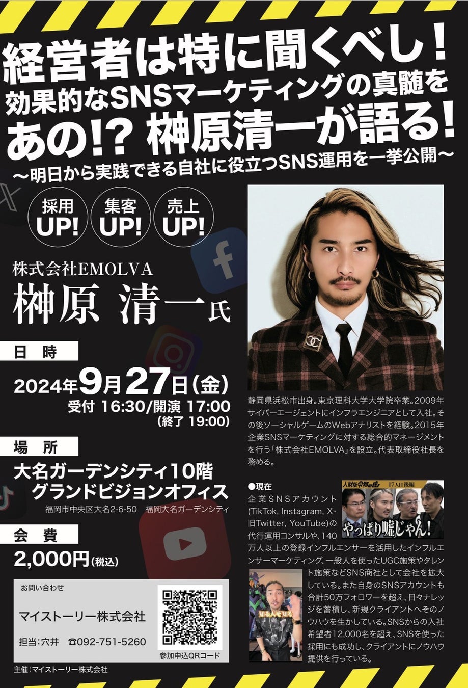 【福岡発!】50社集結のSNSマーケティングセミナーに株式会社EMOLVA代表の榊󠄀原清一が登壇!主要SNS4プラットフォームの最新トレンドと採用・認知・ブランディング強化のノウハウを公開!