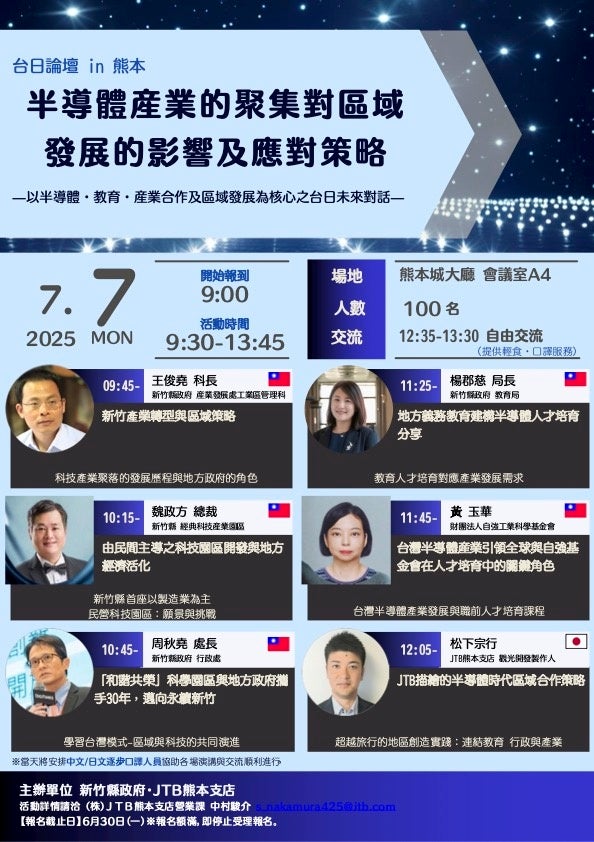 株式会社JKL331(本社:東京都世田谷区)は、2025年7月7日(月)に熊本城ホールにて開催される日台フォーラム「半導体産業の集積による地域発展効果とその対応 ― 半導体・教育・産業連帯・地域発展を軸とした日台未来対話 ―」の企画・プロデュースを行います。