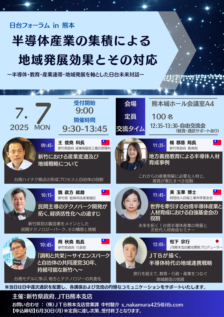 本フォーラムは、台湾新竹県政府、JTB熊本支店との共催により実施され、台湾からは新竹サイエンスパークの行政運営に携わる幹部や教育局長、民間企業の代表者らが来熊。台湾の地域発展モデルや、半導体産業と教育・行政の連携、そして人材育成のあり方について講演・対話が行われます。