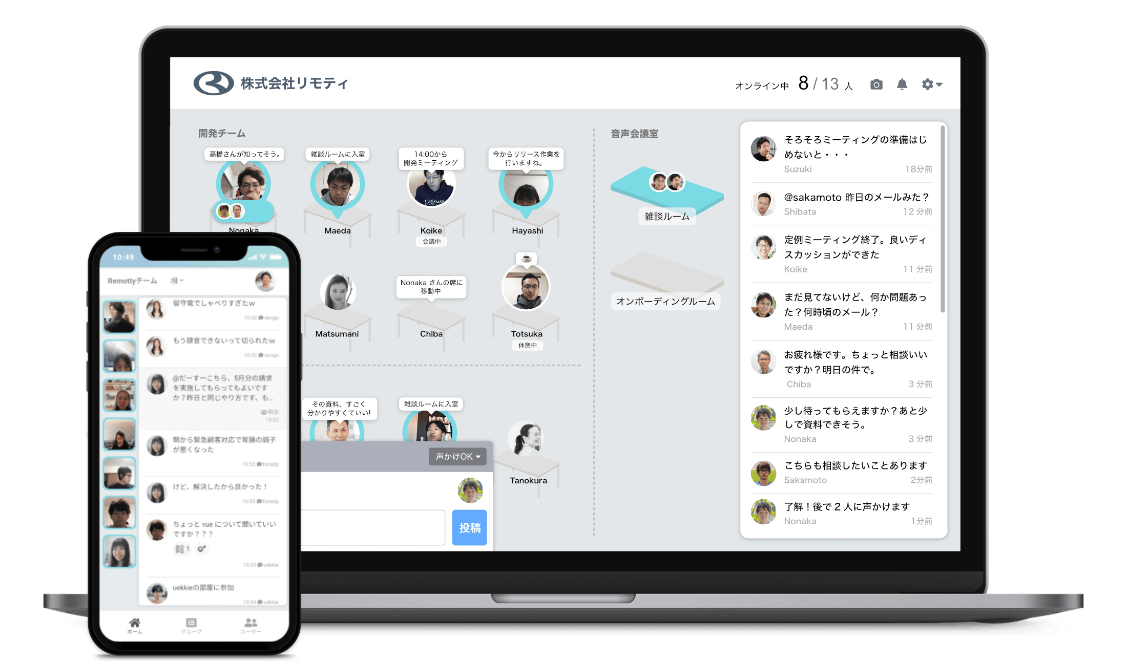 Remottyは在宅勤務で失われがちな「人がいる存在感」「雑談」「声かけ」「他の人の声」「相談」といった、オフィスで働いていた時に自然と行っていたコミュニケーションを実現するためのバーチャルオフィスツールです。