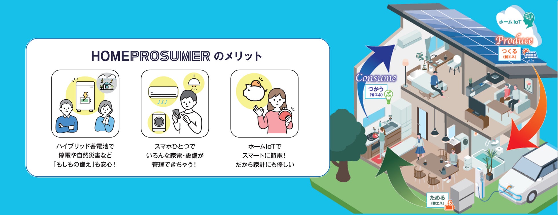 ホームプロシューマは、家庭のエネルギーをつくる(創エネ)ためる(蓄エネ)つかう(省エネ)を、ホームIoTでスマートに管理する次世代の暮らしです。ホームIoTとハイブリッド蓄電池で太陽光発電を効率活用し、スマホでいろいろな家電や設備を一元管理することで賢く省エネ・節電できます。