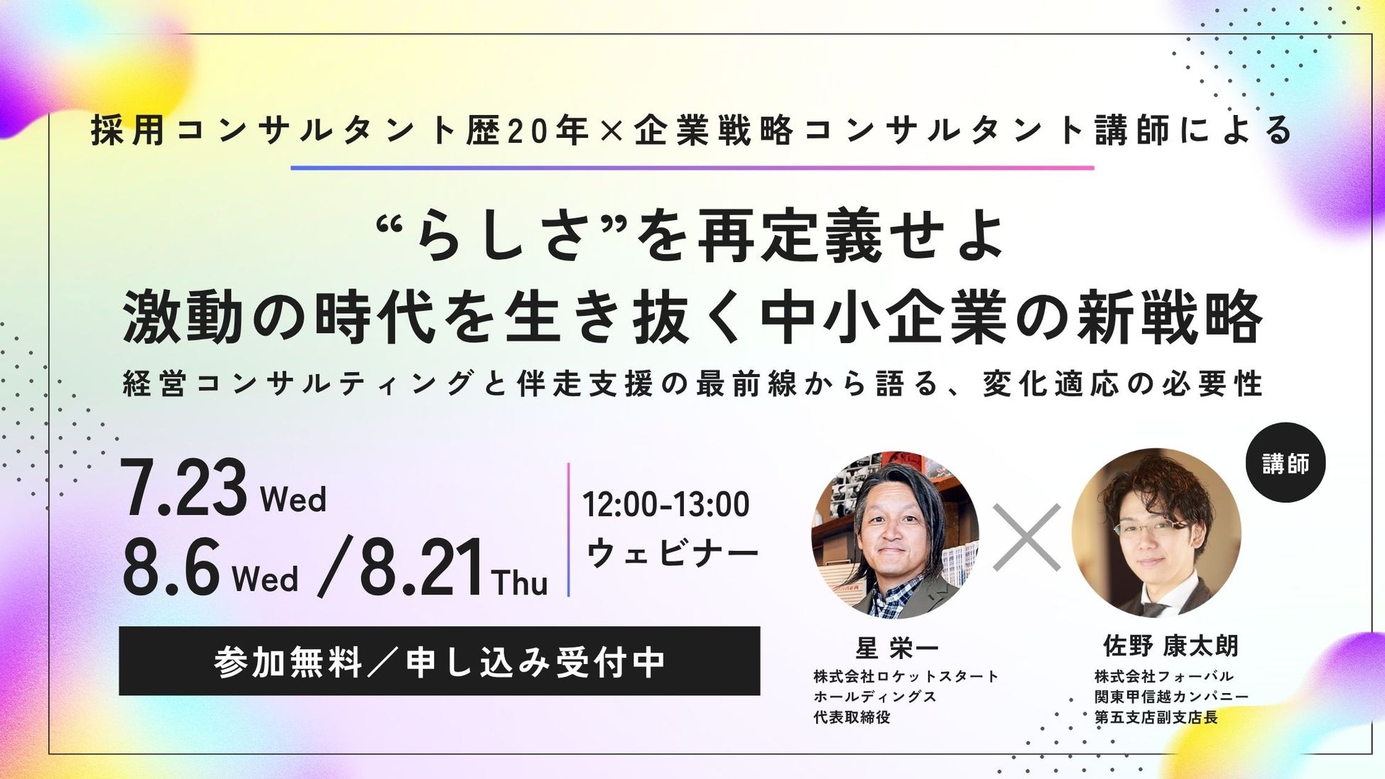 株式会社ロケットスタートホールディングスと株式会社フォーバルは、2025年7月・8月にオンラインで共催セミナー「“らしさ”を再定義せよ――激動の時代を生き抜く中小企業の新戦略」を開催します。