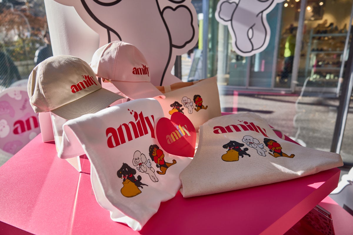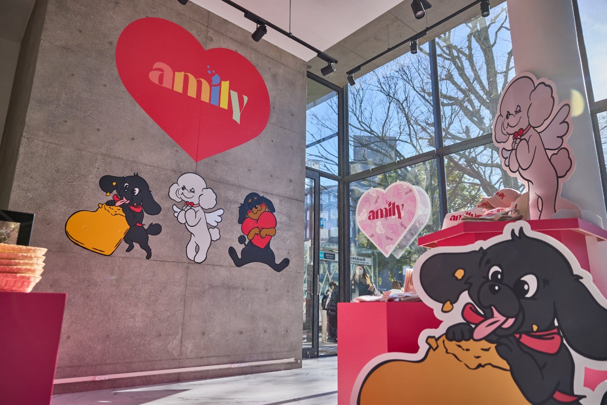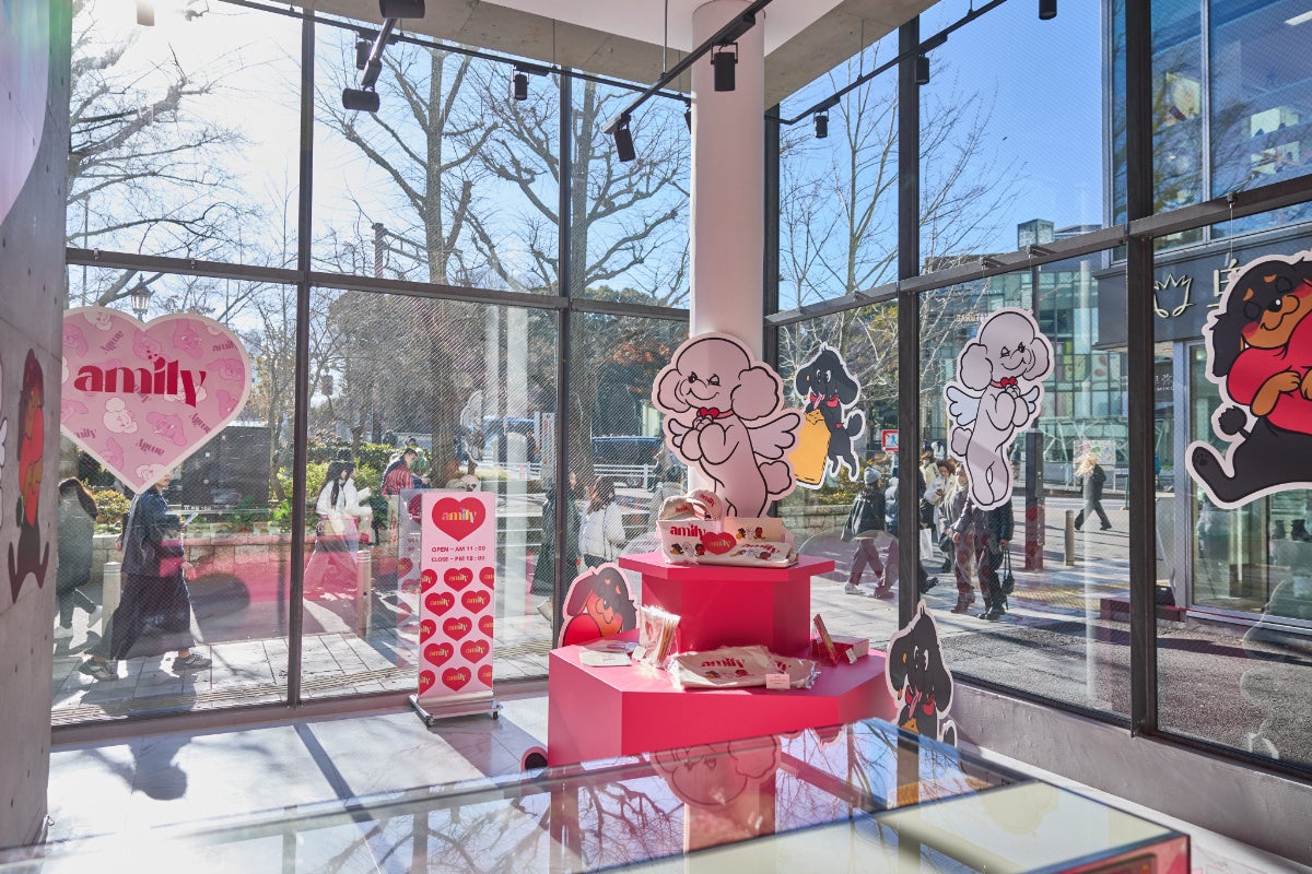 JR山手線原宿駅徒歩1分の明るい店内では、ありしゃんと杉山絵美の愛犬キャラクターがお出迎え!原宿店限定のフレーバークッキーの販売ほか、AMILYオリジナルグッズもご購入いただけます。