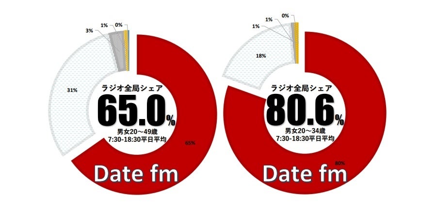 宮城地区ラジオ全局で、Date fmが平日ワイド番組を放送する7:30~18:30において、コアターゲットとする 男女20~49歳でシェア65.0%、個人聴取率4.3%。男女20~59歳でシェア55.4%、個人聴取率4.1%。 男女20~34歳(F1M1)でシェア80.6%、個人聴取率4.1%。男女35~49歳(F2M2)でシェア58.5%、 個人聴取率4.4%。 7:30~11:00(月~金)「Morning Brush」、13:30~15:50(月~木)「RAD~Radio All Day~」、 16:00~18:30(月~木)「SOUND GENIC」。11:30~12:50(金)「Sendaian Hot Music」、13:30~ 18:30(金)「AIR JAM Friday」、全ての平日ワイド番組で、コアターゲットとする男女20~49歳、男女20~ 59歳、F1M1、F2M2、いずれの区分でも宮城地区単独トップを獲得!
