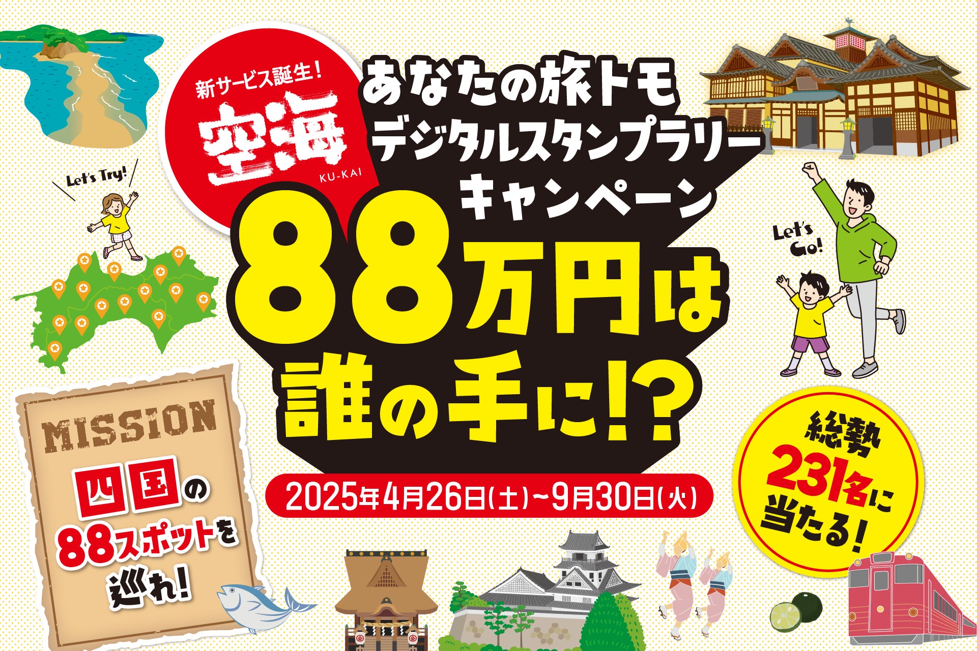 旅をもっと楽しくするデジタルスタンプラリー「空海」のサービス誕生を記念して四国でキャンペーンを開催します。 2025年4月26日から9月30日まで、四国八十八ヶ所にちなんで四国内に設定した88のスポット巡りを楽しむデジタルスタンプラリー「空海」は、スマートフォンから誰でも簡単に参加できます。