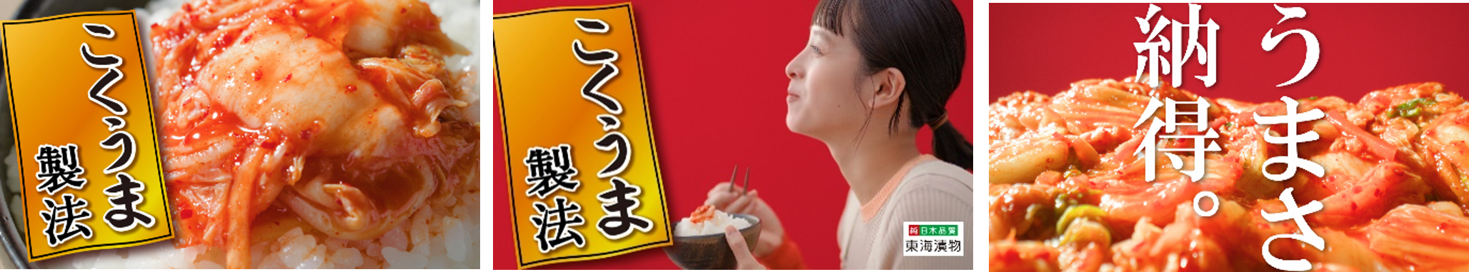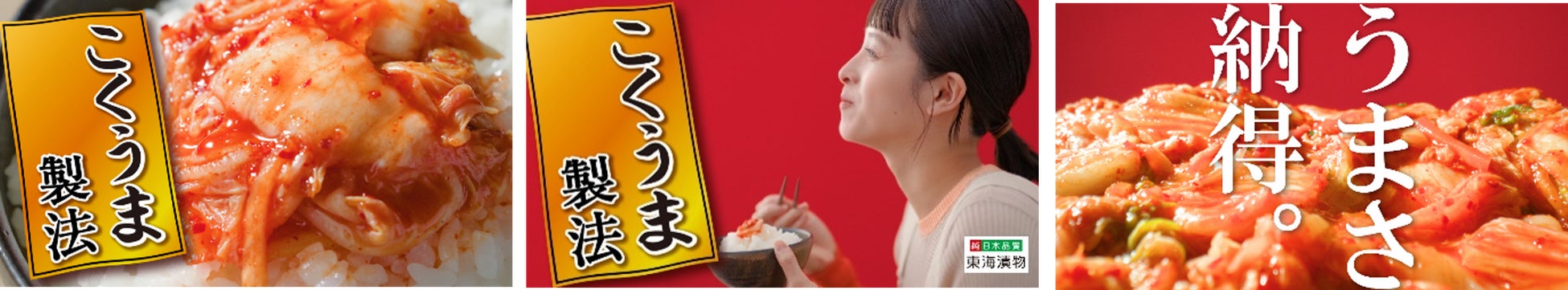 「こくうまキムチ」の中心的価値である「ごはんに合う」を追求するため、下漬、本漬、キムチ漬という独自の三段熟成を施した「こくうま製法」で生産。コクと旨みには、カツオ魚醤とイカゴロをベースにホタテエキス・カキエキス・醤油を加え「もっともごはんに合う」おいしい「こくうまキムチ」に仕上げました。口に広がる「コク」の深さと、「旨さ」の質が違う味を磨きぬいたニッポンのキムチ「こくうまキムチ」をご家族でお召し上がりください。