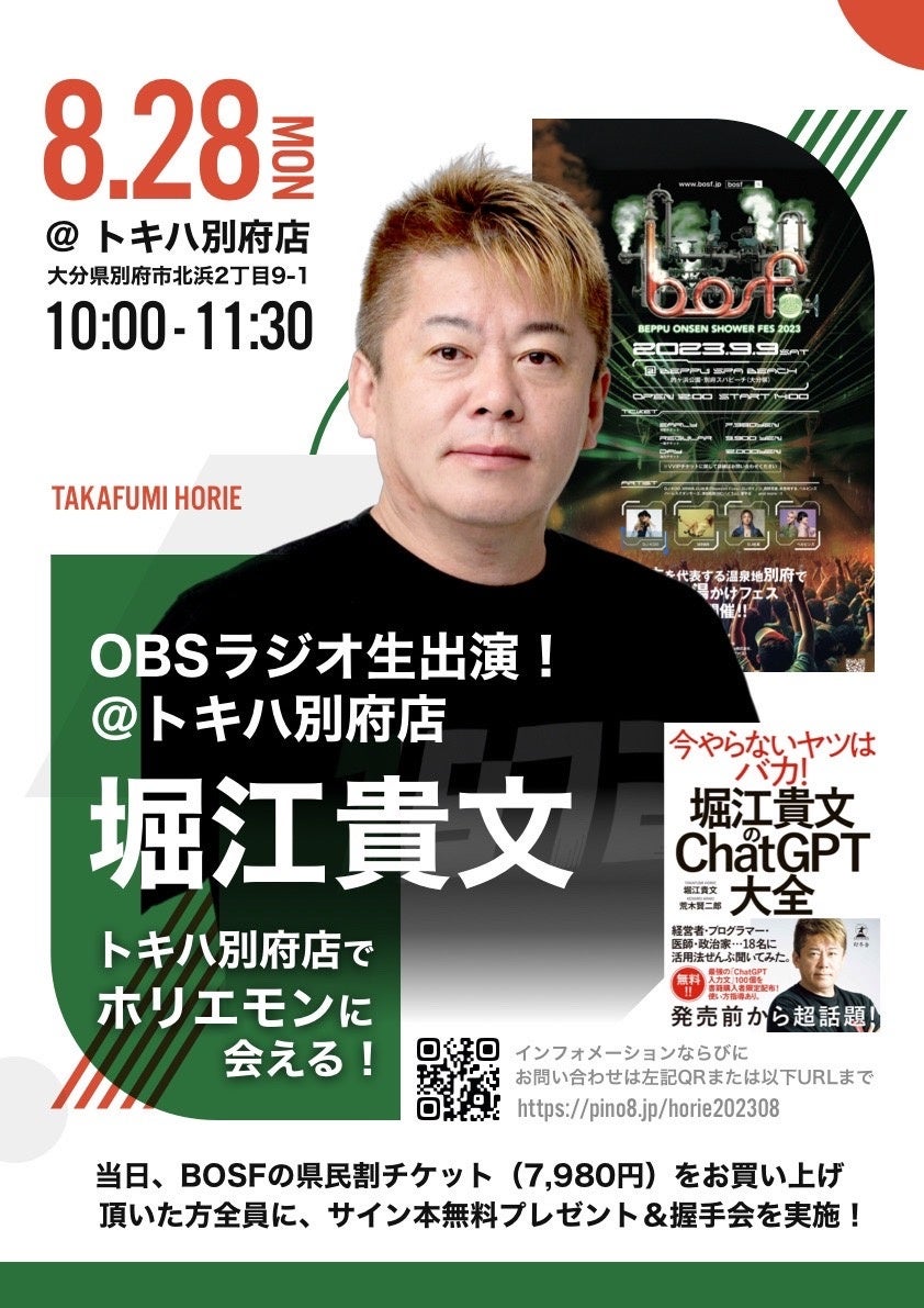この度、2023年8月28日(月)10時〜11時30分に、実業家の堀江貴文によるOBSラジオへの生出演&トークショーを、大分県別府市のトキハ百貨店 別府店にて実施致します。