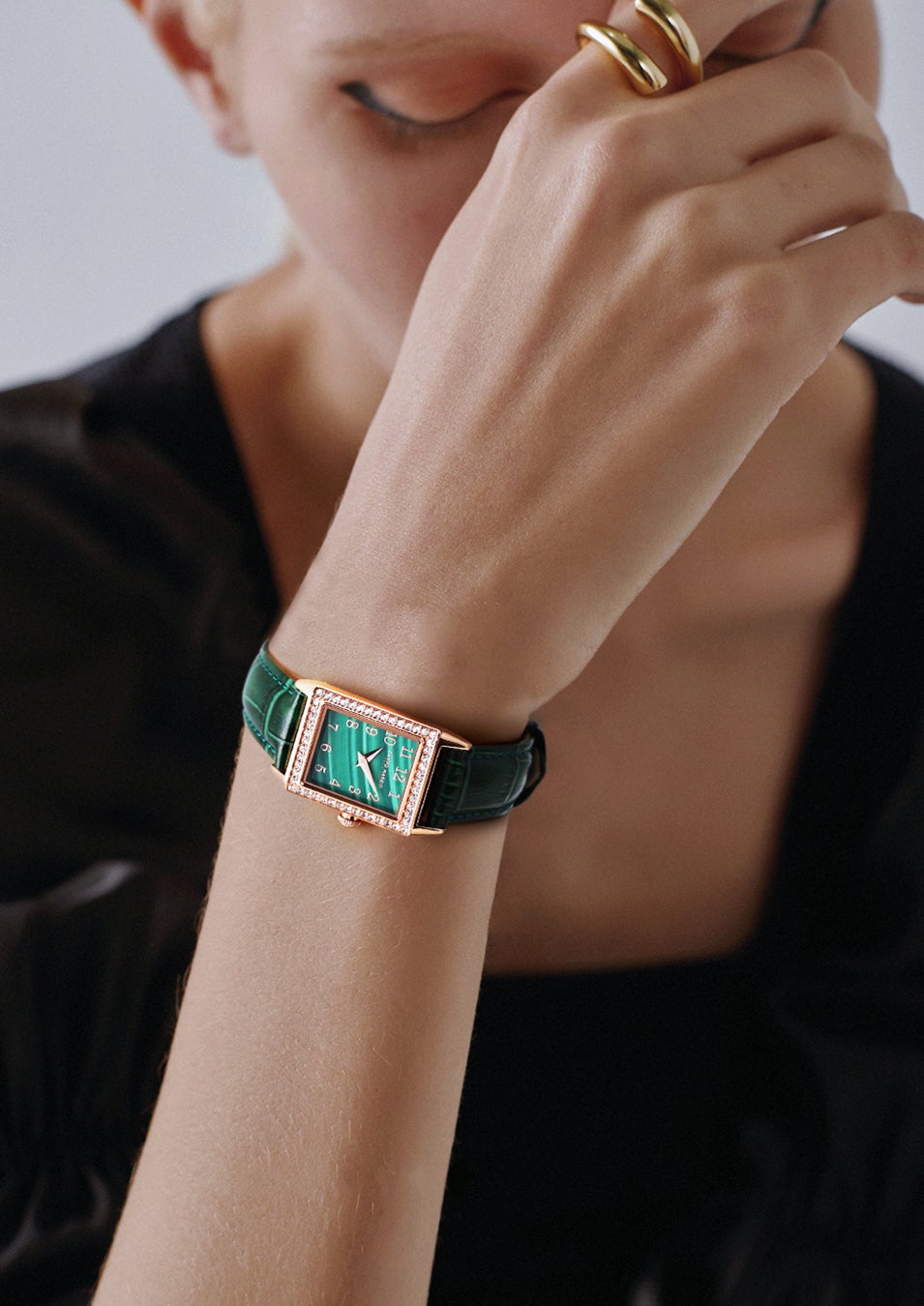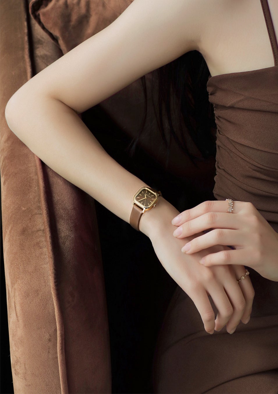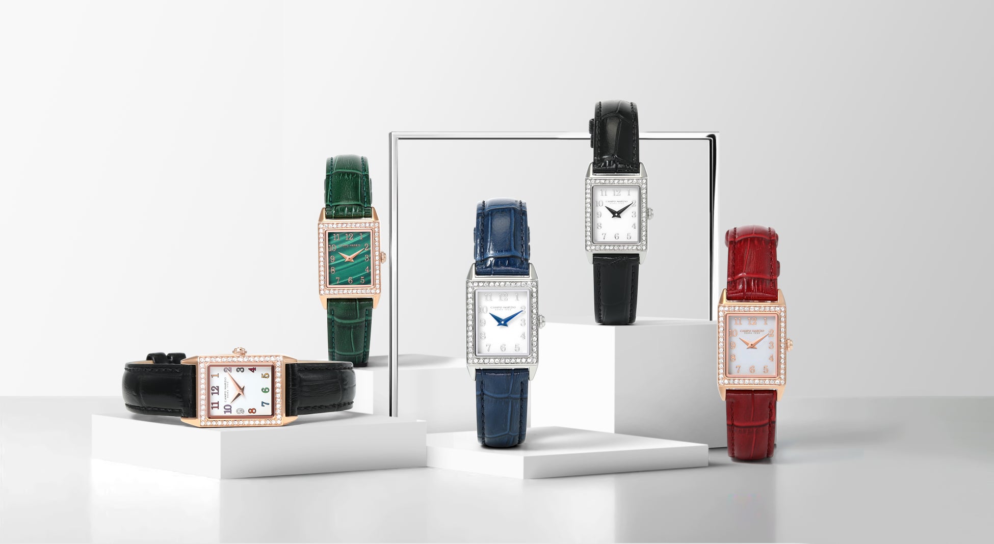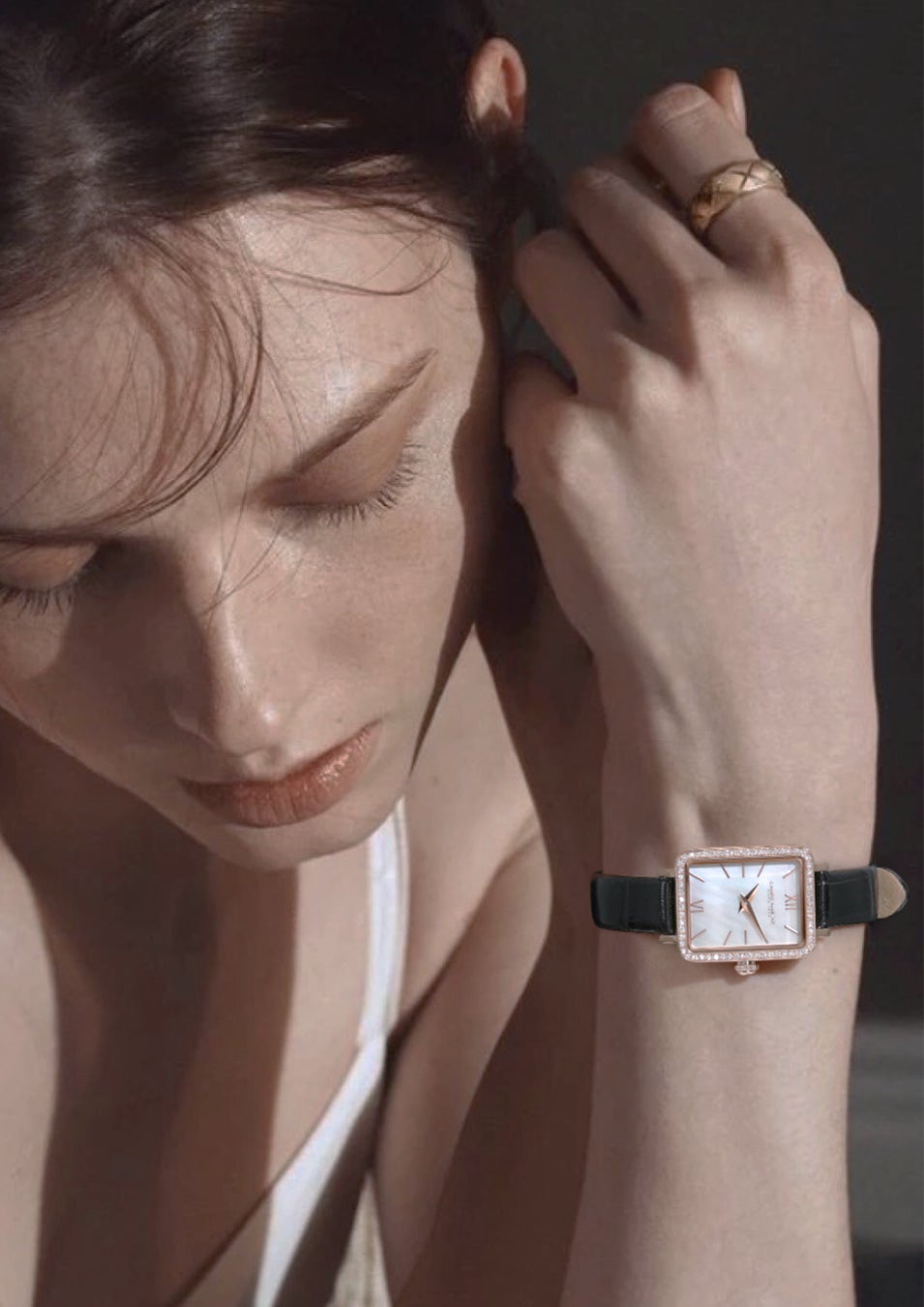 文字盤周りのクリスタルがスクエアの文字盤を華やかにさせたモデル。