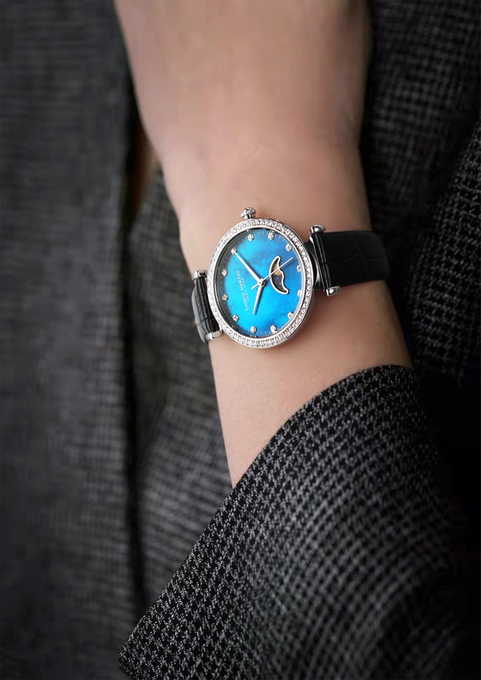月の満ち欠けを表現する「ムーンフェイズ」。不均一なカラーの文字盤で空をイメージ。