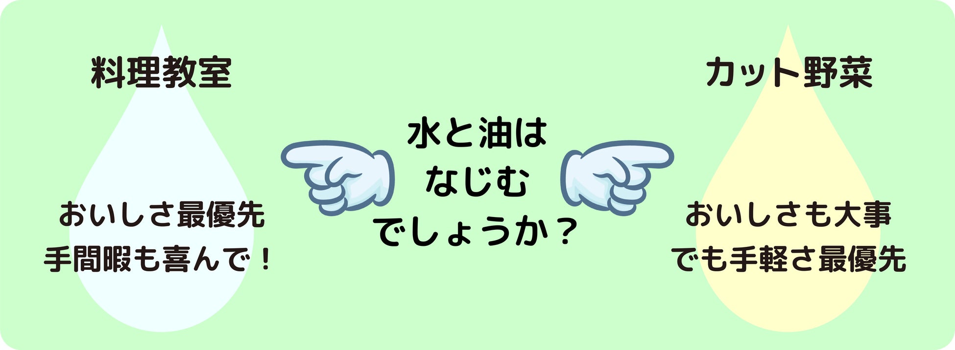 これを試す上で、最高の舞台は料理教室でしょう。そこに集まる先生・生徒は、積極的に料理を楽しみたい方ばかり。そのみなさまに「カット野菜、いいね!」と認めていただけたなら、カット野菜が実はスタンダードな食材であることの証左となるでしょう。今後、女性の社会進出はさらに進み、並行して男性や高齢者の家事参加も進むでしょう。それに伴い、時短カンタンニーズは一層強まるはずです。カット野菜が「丸ごと野菜に並ぶ、料理のスタンダード」として認知され、用途が広がれば、社会全体にとってプラスになるでしょう。