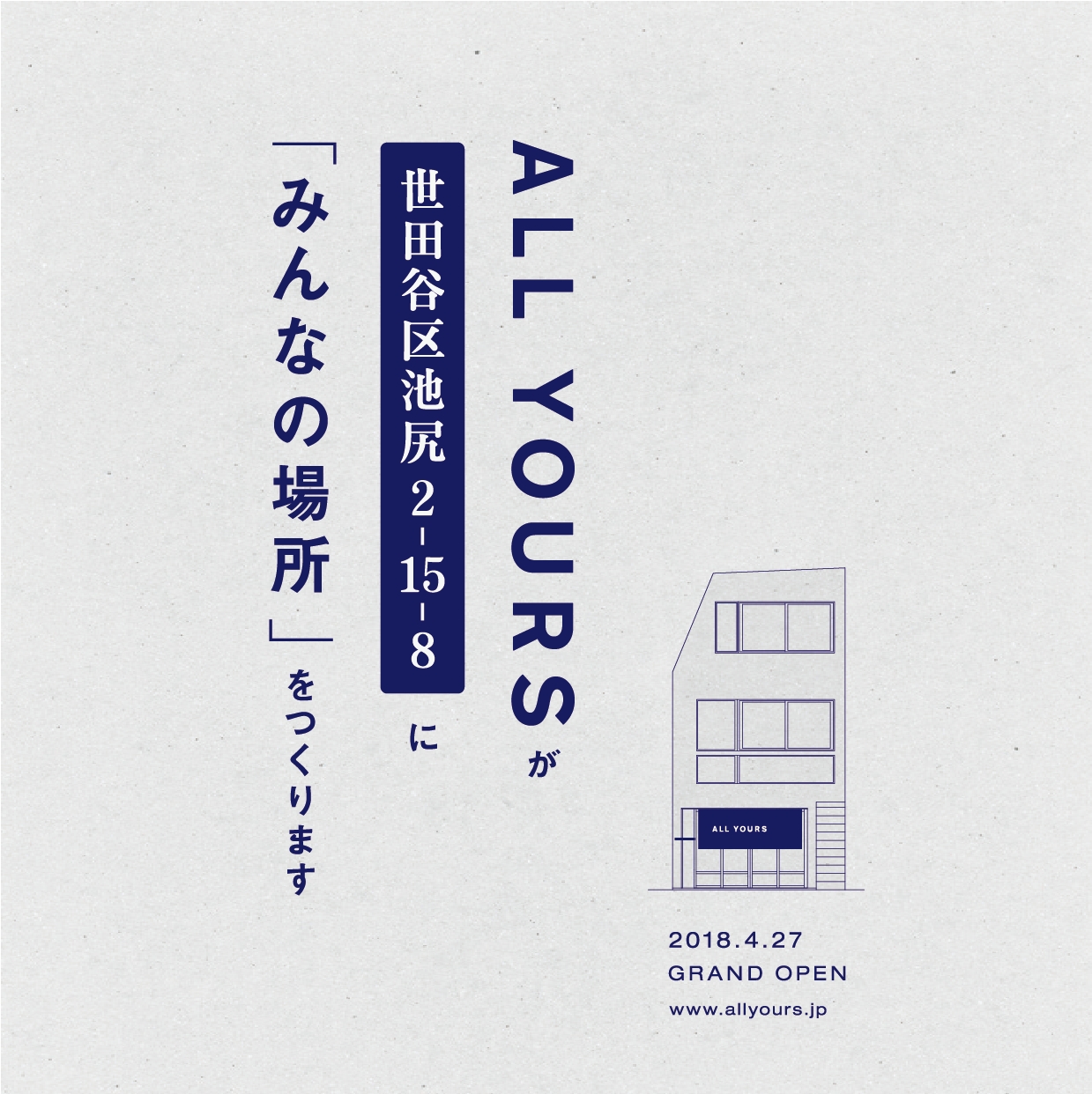 株式会社オールユアーズ(代表:木村昌史 本社:東京都世田谷区池尻)は、分散していた本社と店舗の機能を集約し「みんなの場所」と称す、新しいリアルな場の形を体現したフラッグシップストアを、世田谷区池尻2-15-8に(東急田園都市線 池尻大橋駅下車 徒歩5分)2018年4月27日(金)よりオープン致します。
