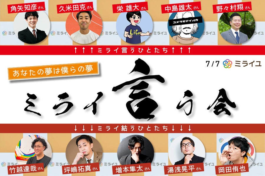 今回、夢を語る5名(ミライ言う人たち)と共に、夢を応援しサポートする5名(ミライ結う人たち)が、どう実現させるかについて熱いトークを繰り広げます。