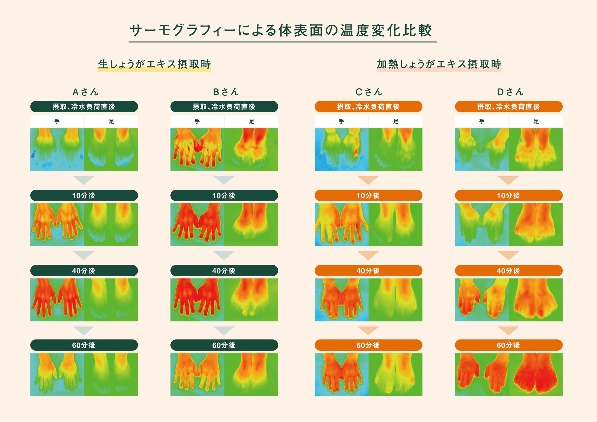 実験内容:常温の水で割った加熱したしょうがエキス(6名)と、生のしょうがエキス(6名)100ml摂取後、測定部を冷水負荷し、体表面の温度を60分後まで10分おきにサーモグラフィーで測定しました。