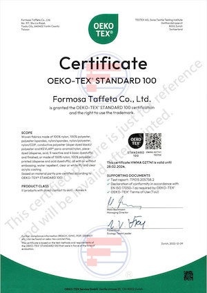 ファブリックはエコテックス®スタンダード100認証の台湾にある工場で生産しています。