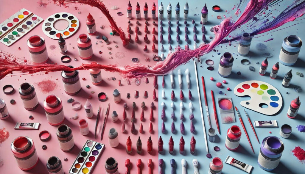 画期的な塗料「マゼンナ」は、混ざった色を元の色に戻す分離色効果を持っています。例えば、ピンクであれば赤と白に、紫であれば青と赤に分離します。