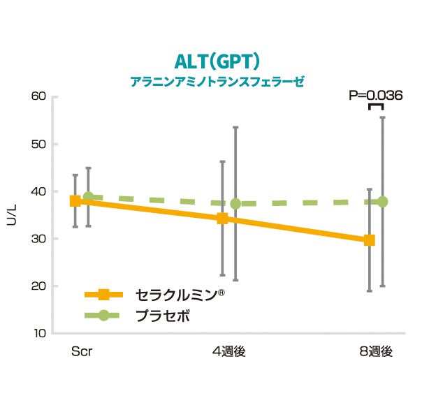 疾病に罹患していない健常者68名(38-69歳)に対して、無作為化プラセボ対照二重盲検並行群間比較試験を実施しました。1日朝夕2回、1回あたり90mgのクルクミンを含む高吸収クルクミン「セラクルミン®」のカプセルまたはクルクミンを含まないプラセボのカプセルを8週間摂取させ、開始前と8週間後の肝機能酵素ALTの値の変化を評価したところ、セラクルミン®を摂取させた群では、プラセボを摂取させた群と比較してALTの値が有意な低下を示しました (P<0.05) ※。この結果から、セラクルミン®の摂取は、肝機能酵素ALTの健常域でやや高めの値の低下に役立つことが示されました。