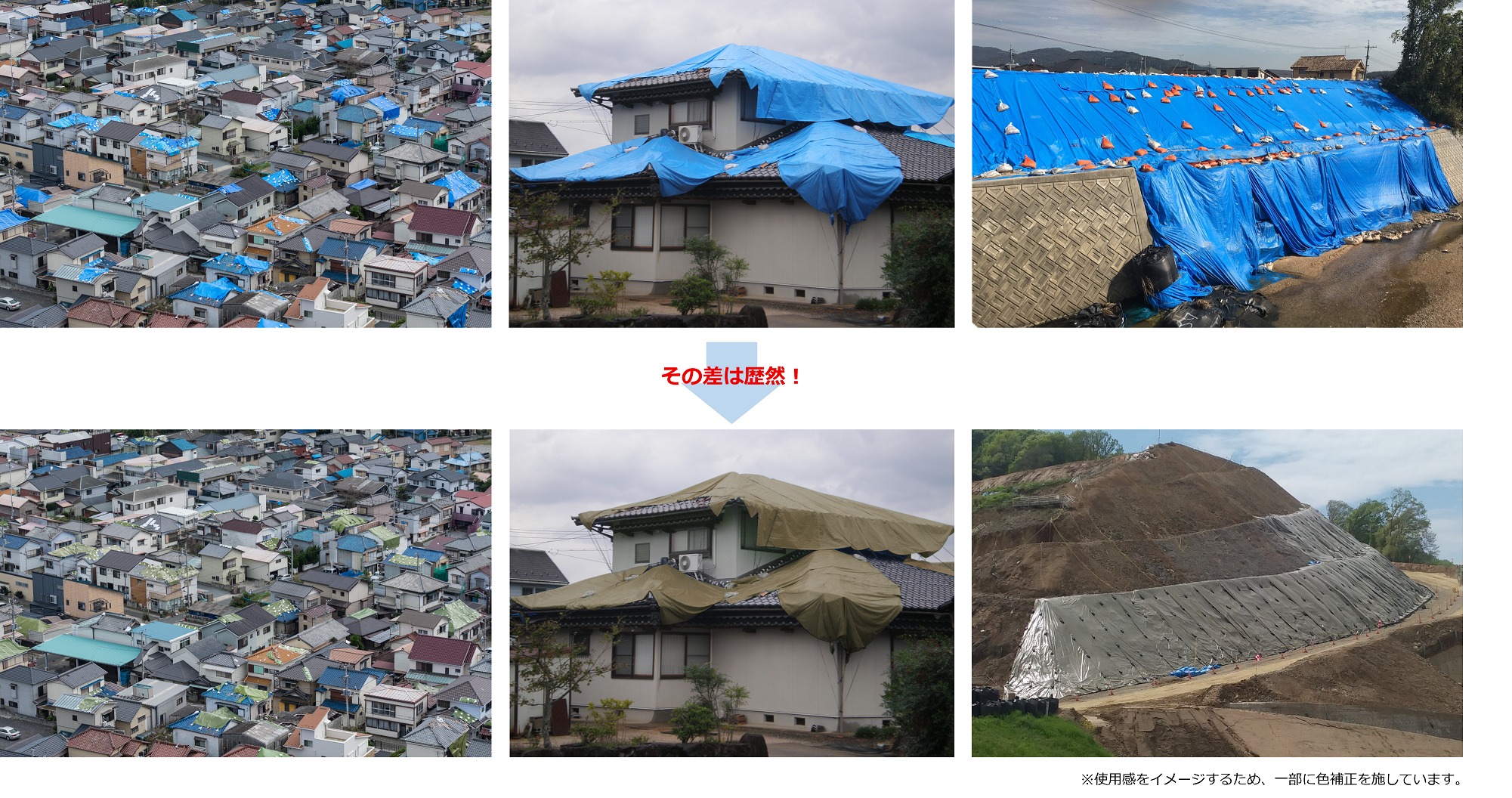 「ターピー 防災・減災シート」は景観になじみやすいODグリーンカラーを採用し、災害復興時の屋根養生や崩れた法面養生などに使用しても目立ちにくい仕様です。