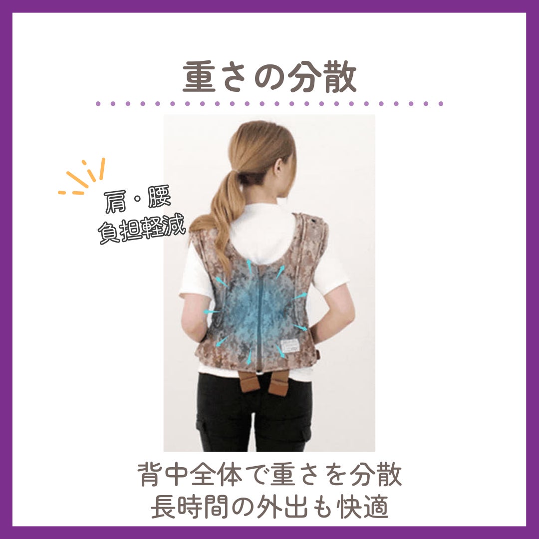 重量分散写真 抱っこひもを使うときに、肩や腰に無理が来て痛みをこらえたことはありませんか? BTベストベビーキャリアは肩の腰だけでなく背中全体に重さを分散させ 外出時に長時間使用しても無理なく使用できます。