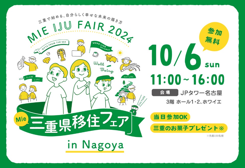 三重県では、移住促進に向けてより多くの方々に三重県での暮らしの魅力を知っていただくため、先輩移住者から体験談を聞けるトークショーや気になる市町に個別に移住相談ができる「三重県移住フェア」を、10月6日(日)に名古屋、12月14日(土)に大阪にて開催します。