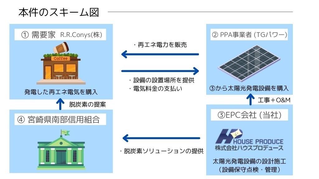 今回の取り組みは、法人向けに太陽光発電のPPAサービスを展開する株式会社TGパワー(本社:東京都渋谷区)のPPAサービスを活用し、地方の金融機関と協力して、地元企業の脱炭素促進としての再生可能エネルギー導入の推進と、災害による停電時の非常用電源の確保を目的とした同社初の事例となる。TGパワーが提供するPPAサービスの契約期間は10年間で、太陽光発電システムの設計・施工、および10年間の保守点検は株式会社ハウスプロデュースが行う。