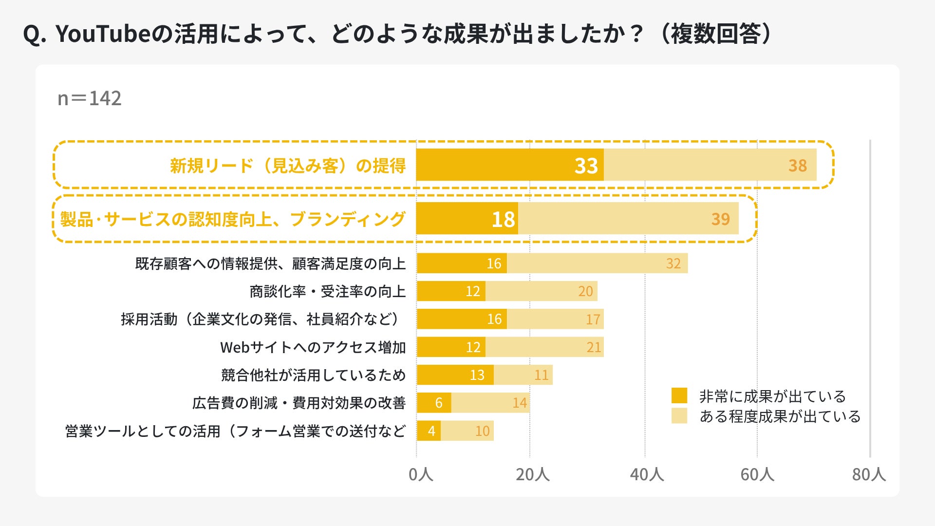 また、その成果として「新規リード(見込み客)の獲得」や「製品・サービスの認知度向上、ブランディング」などが上位に挙げられました。この結果から、YouTubeを積極的に活用する企業が市場での優位性を着実に確立している実態が明らかになりました。