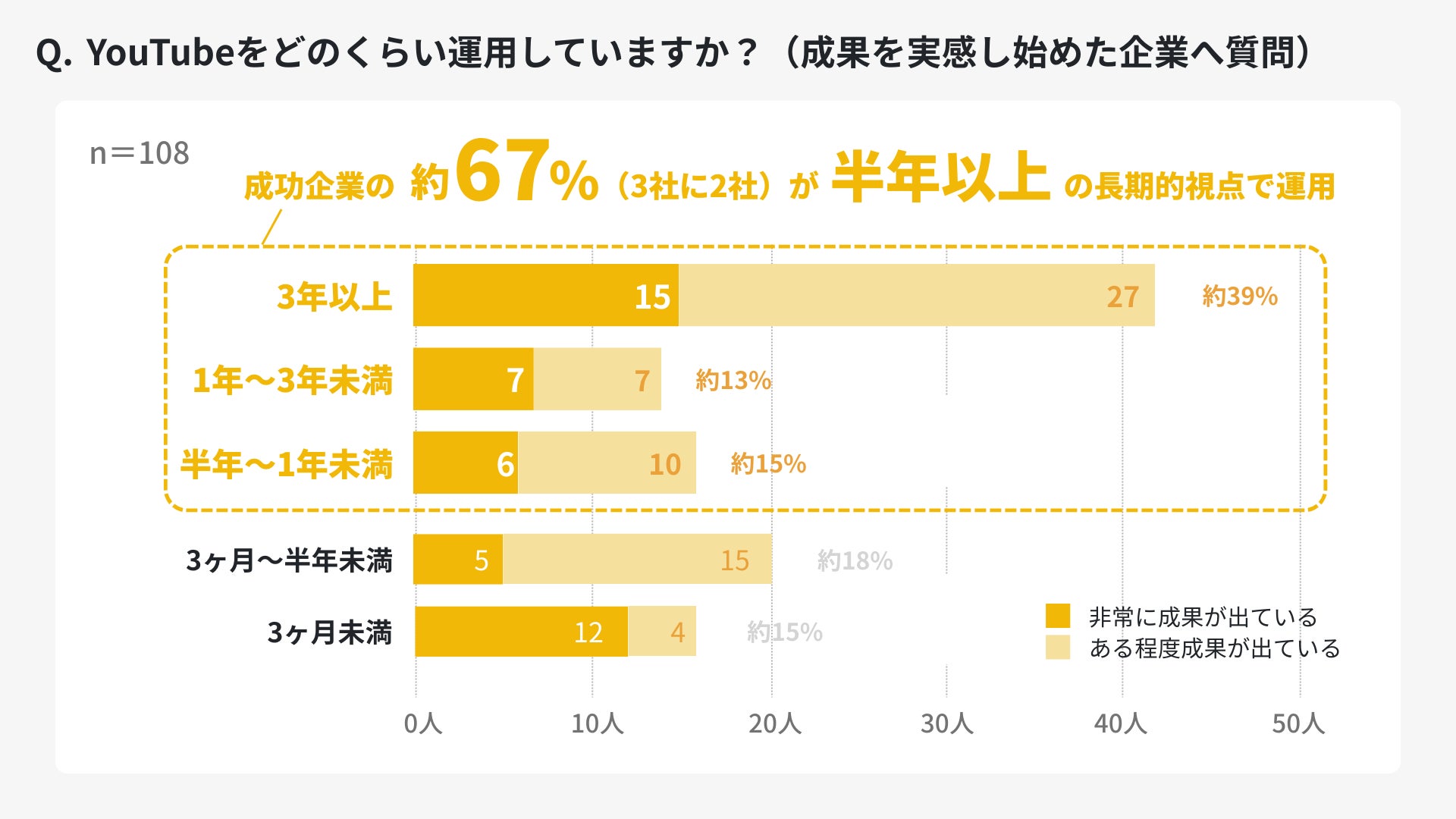 さらに注目すべきは、成果を実感し始めた企業の約67%(3社に2社)が「半年以上」の長期的視点で運用しているという点です。内訳を見ると、「3年以上」が約39%、「1年〜3年未満」が約13%、「半年〜1年未満」が約15%と、長期間にわたって継続的に運用している企業が成功を収めていることが明確になりました。これは、YouTube活用が短期的な施策ではなく、中長期的な運用・戦略的な継続こそが具体的な事業成果へと繋がることを強く示唆しています。