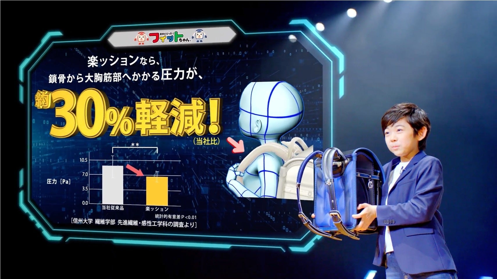 豪華なステージ上に並べられたランドセルがセンターライト照らされると竹野谷咲ちゃんと嶺岸煌桜くんが登場。「これからは選ぶ基準が変わります」と竹野谷咲ちゃんが振りだし、嶺岸煌桜くんが「フィットちゃんだけの肩ベルトの新発明」と続くと、2人揃って「その名も楽ッション」とプレゼンテーションのテーマを発表!その後は、データを使って特徴を説明したり、ランドセルに触れたり背負ったりしながら効果を実演したり、2人の息のあったプレゼンで商品を紹介していきます。
