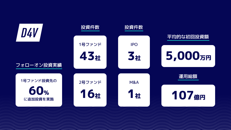 D4V2号ファンドは当社2つ目の基幹ファンドとして2021年に立ち上げ、業種・業界を問わず社会にインパクトをもたらすスタートアップに投資しています。とりわけ、日本から国際的なビジネスの展開を目指す起業家を積極的に支援して参ります。この度は D4V1号ファンドに引き続き、当社のビジョンに共感いただいた国内外の官民ファンド、機関投資家、事業法人等のLP投資家の皆様からのご出資を得て、総額54億円のファンドを組成いたしました。