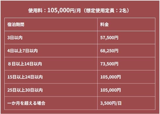 ・使用料には、滞在中使用される電気・水道料、駐車場代などを含んでいます。