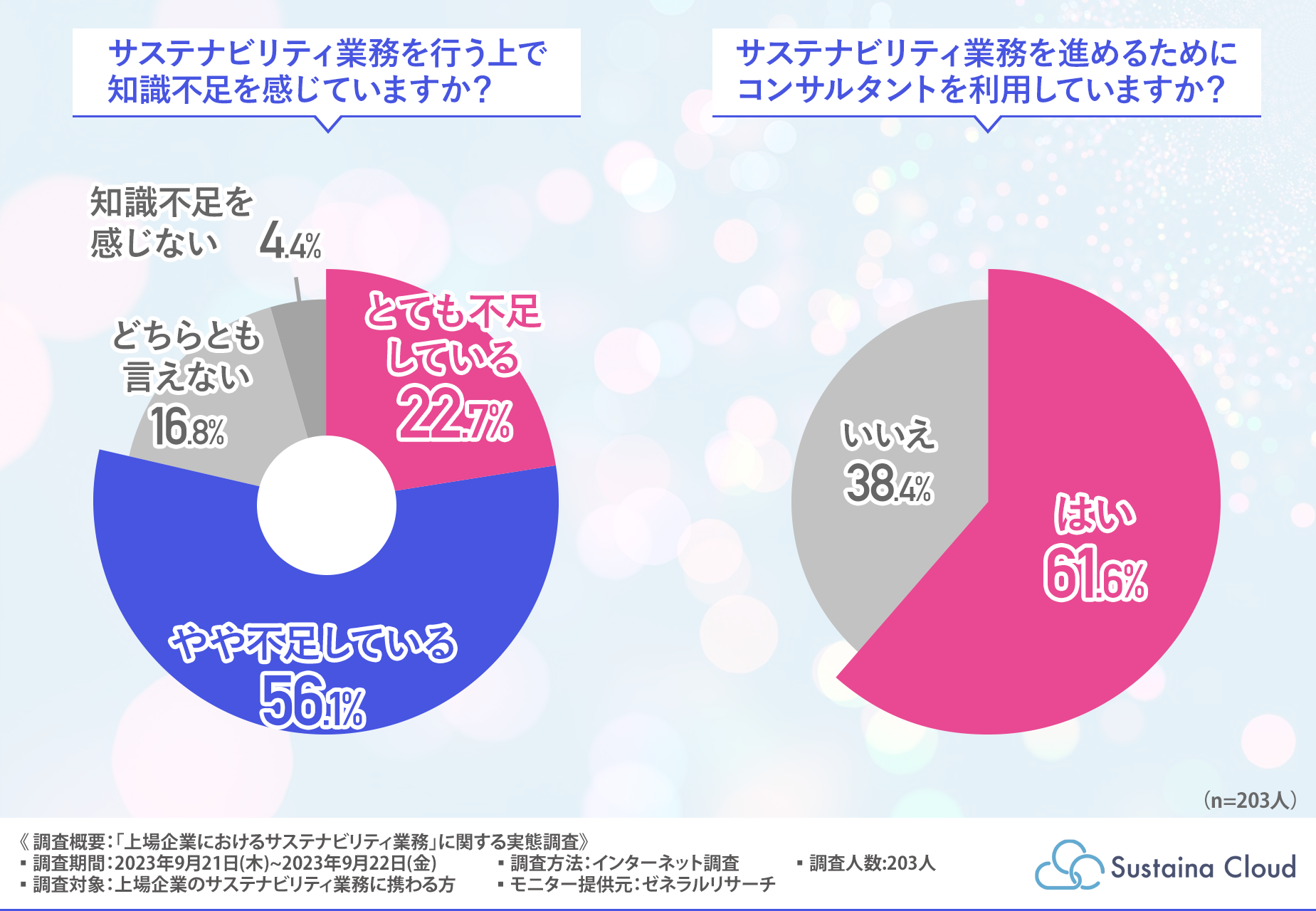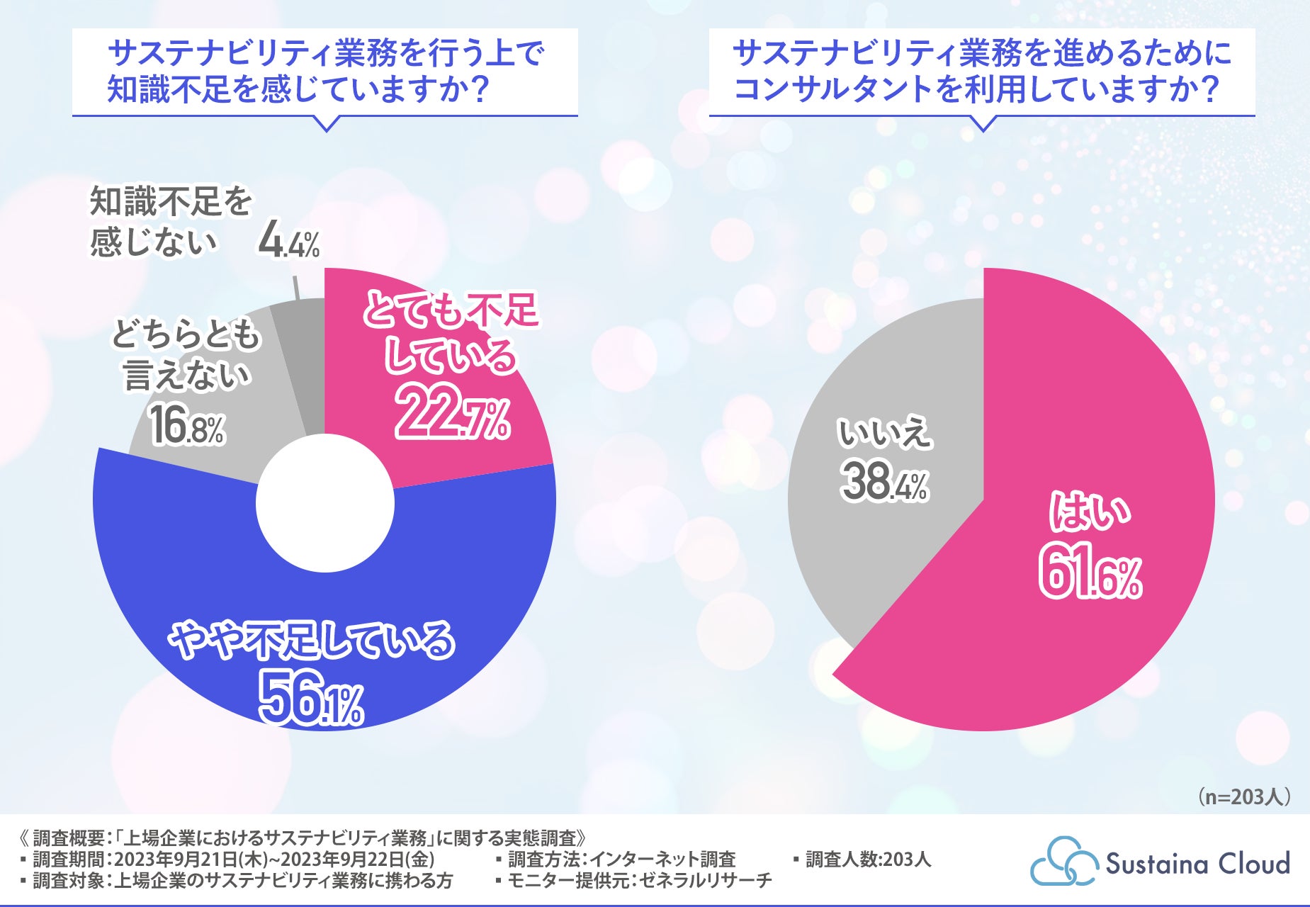 サステナビリティ業務をする上で、人手不足や知識不足を感じている割合はいずれも約8割近くと深刻で、コンサルティングを利用している企業も6割以上であることが明らかになりました。