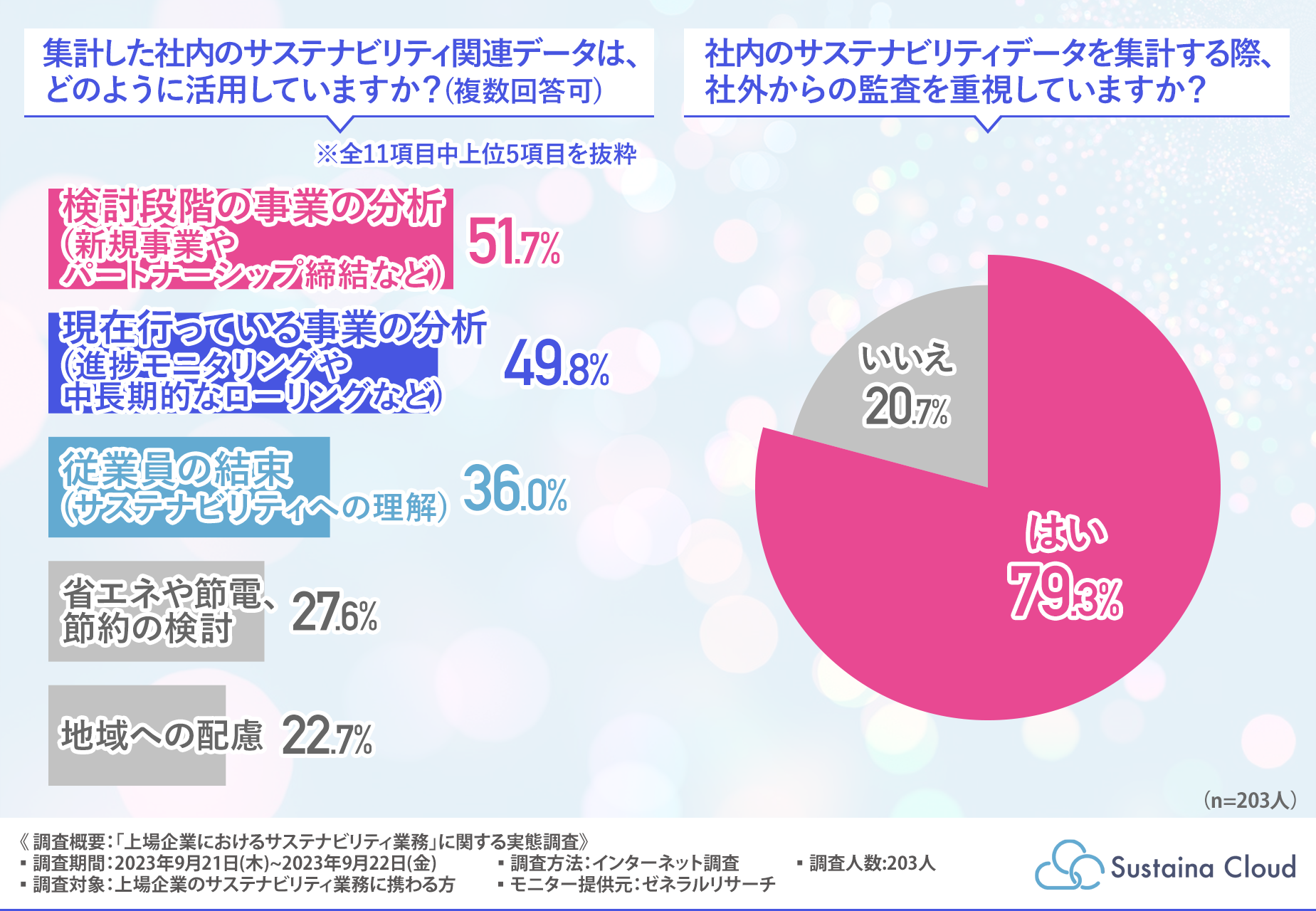 「社内のサステナビリティデータを集計する際、社外からの監査を重視していますか?」と質問したところ、8割近くの方が『はい(79.3%)』と回答しました。