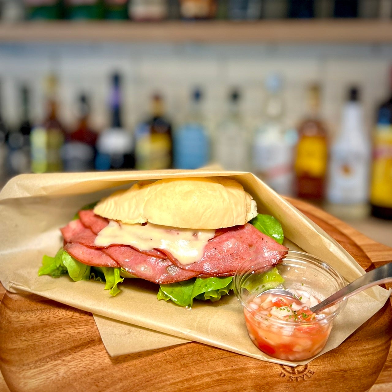 本場の味を忠実に再現した逸品。キボン!サンドイッチスタンドでは開業当初より人気No1のメニュー。塩気の効いたモルタデラ(ハム)が重なりあった層の断面にとろけたチーズの相性は抜群です。