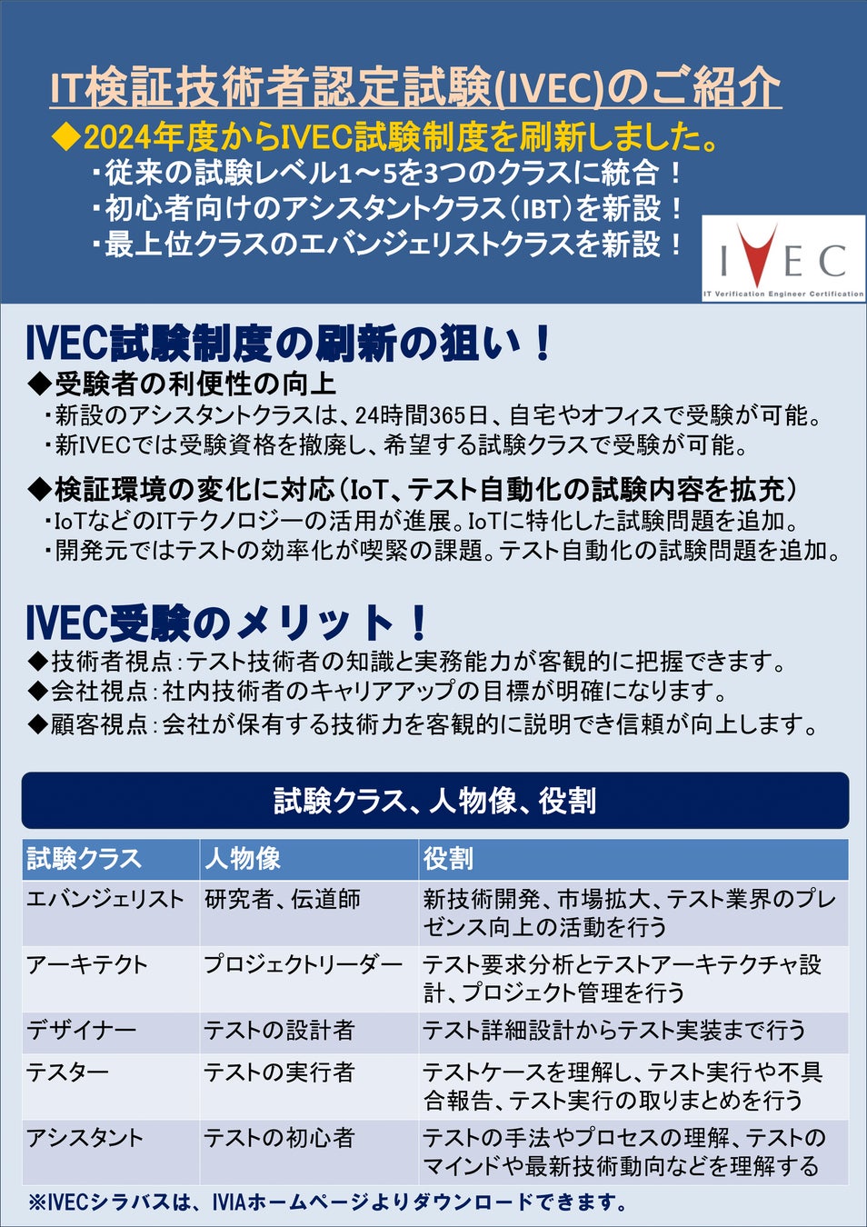 一般社団法人 IT検証産業協会(IVIA)は、IT検証技術者認定試験(IVEC)において、2024年春期試験より試験制度を刷新しました。