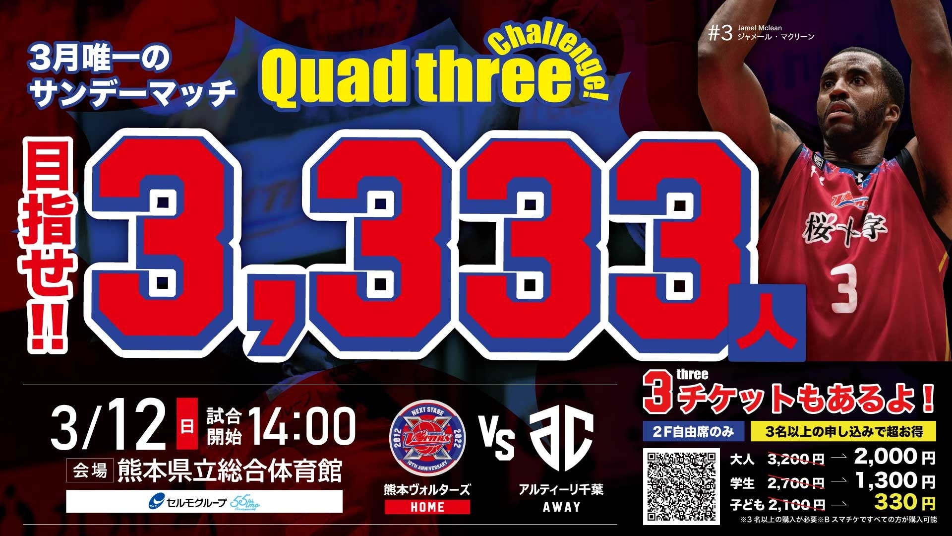3月唯一のサンデーホームゲーム、3月12日(日)に『3,333人(クアッドスリー)チャレンジ』を開催!