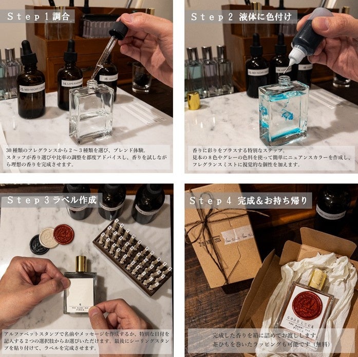 お客様ご自身で香りのブレンドや色付けを行い、オリジナルのフレグランスミストを生み出す特別なひとときをお楽しみいただけます。
