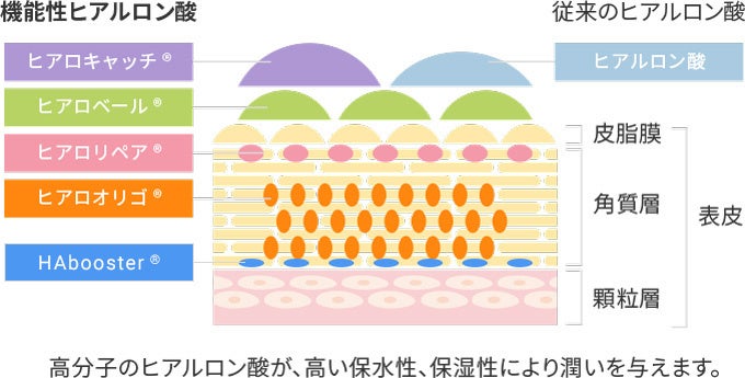 通常のヒアルロン酸に加え、分子量や機能の異なるキユーピー株式会社が独自開発した5つの高機能ヒアルロン酸を配合したオールインワン美容ジェルです。通常のヒアルロン酸も加えた6種類のヒアルロン酸が肌に潤いを与え、なめらかな肌へと導きます。
