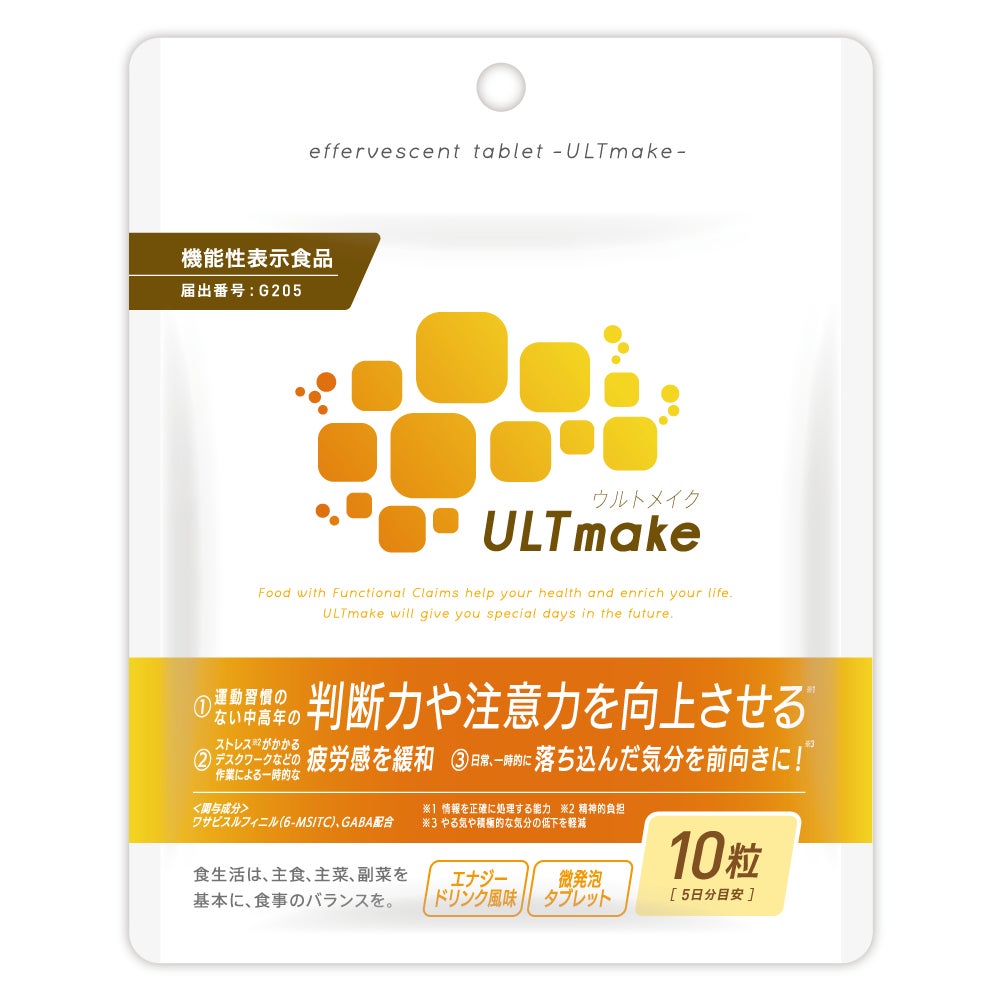 「ULTmake」は「運動習慣のない中高年の認知機能の一部である判断力や注意力を向上させる※1」や「ストレスがかかるデスクワークなどの作業による一時的な疲労感を軽減する※2」、「日常、一時的に落ち込んだ気分を前向きにする※3」に特化したトリプルヘルスクレームの届出が消費者庁に受理された機能性表示食品です。