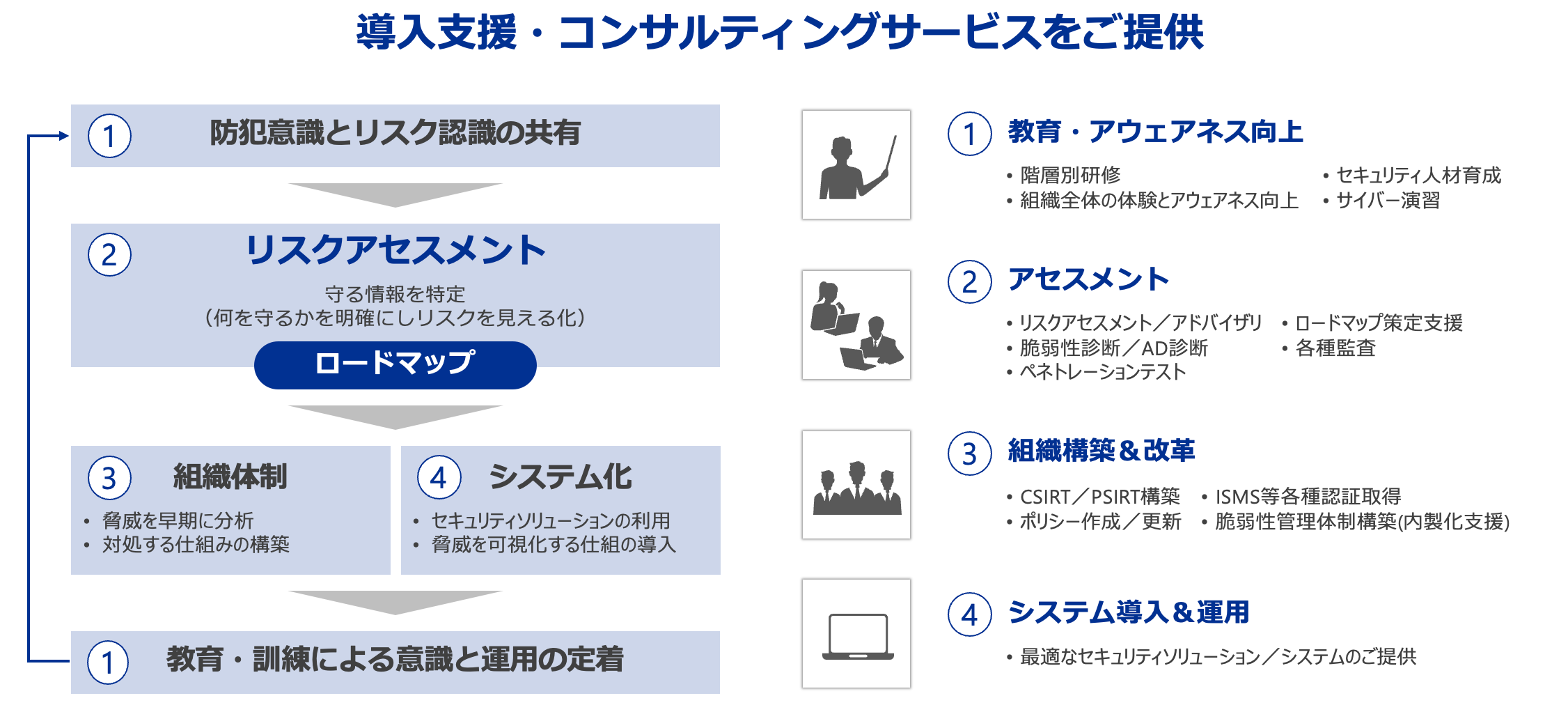 当社は、これらのサービスを通じて、お客様のシステムやネットワークに潜むリスクを高精度で検知し、安心・安全な事業運営を支援してまいります。